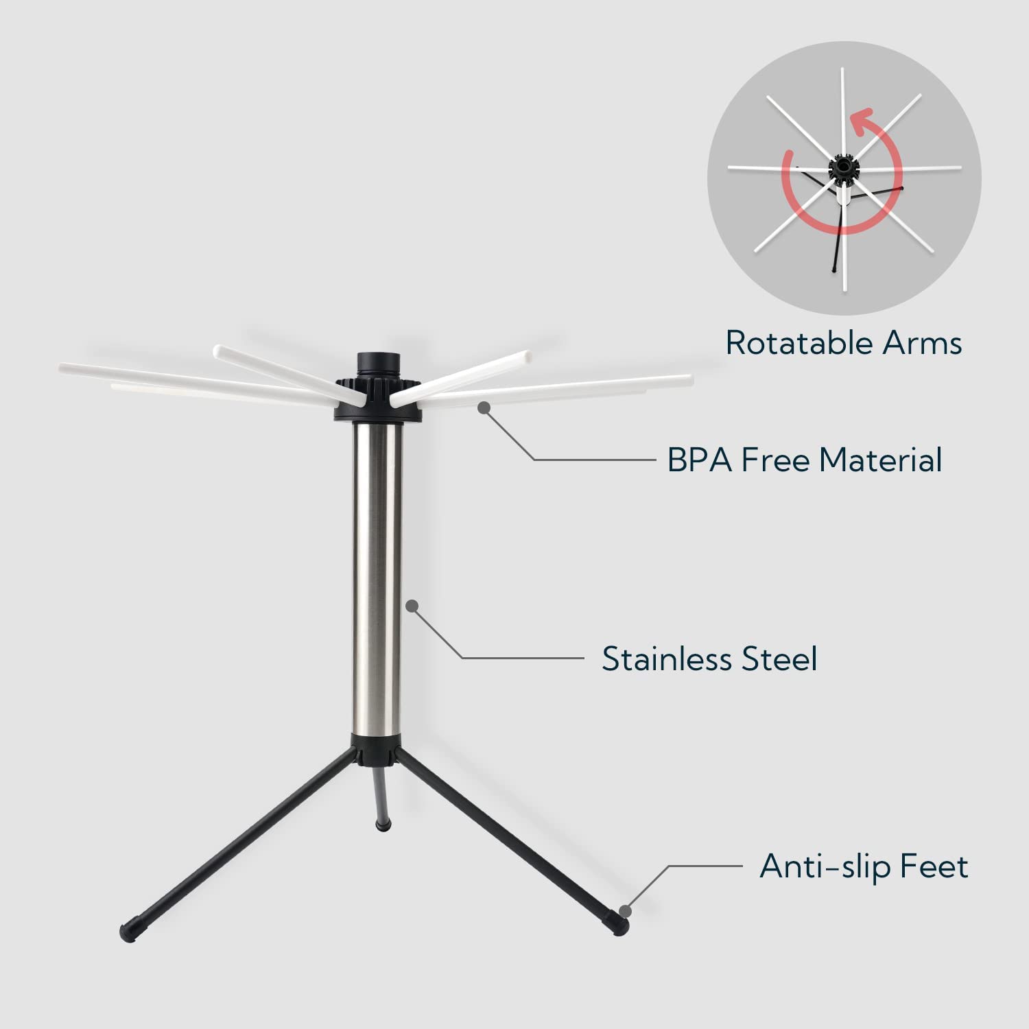 Premium Quality: The main body is made of stainless steel, which is more sturdy . The arms of the noodle hanger are made of Food-grade BPA-free plastic to protect your health. Silicone feet keep it steady and protect the counter from getting scratched