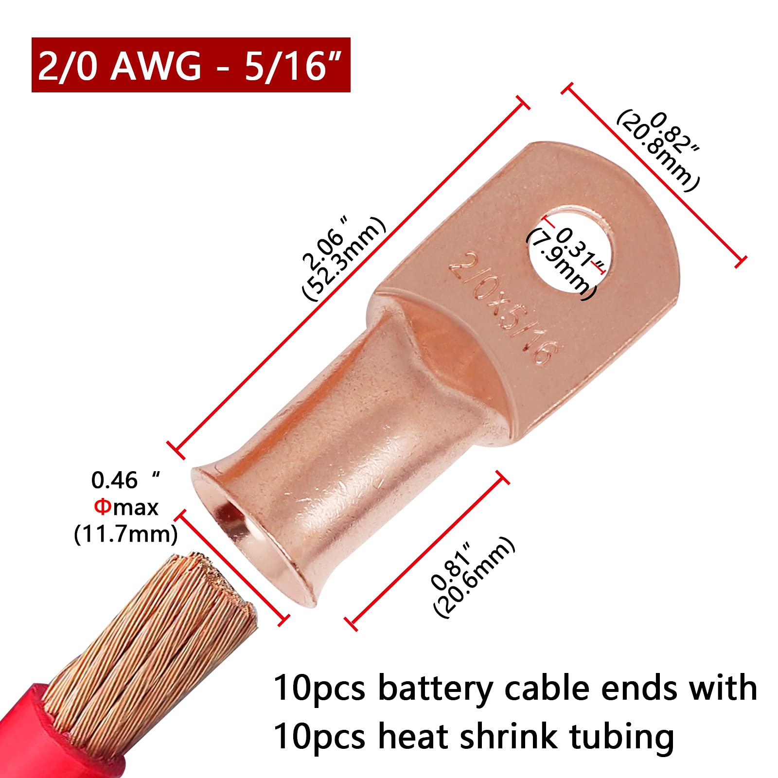 【What You Get:】 10 Pcs per pack of 2/0 Guage (AWG) 5/16" ring terminals, copper lugs closed end termination ring terminals with 10 Pcs 3:1 Dual Wall Adhesive Heat Shrink Tubing Tube for your work(5pcs Black and 5pcs Red).