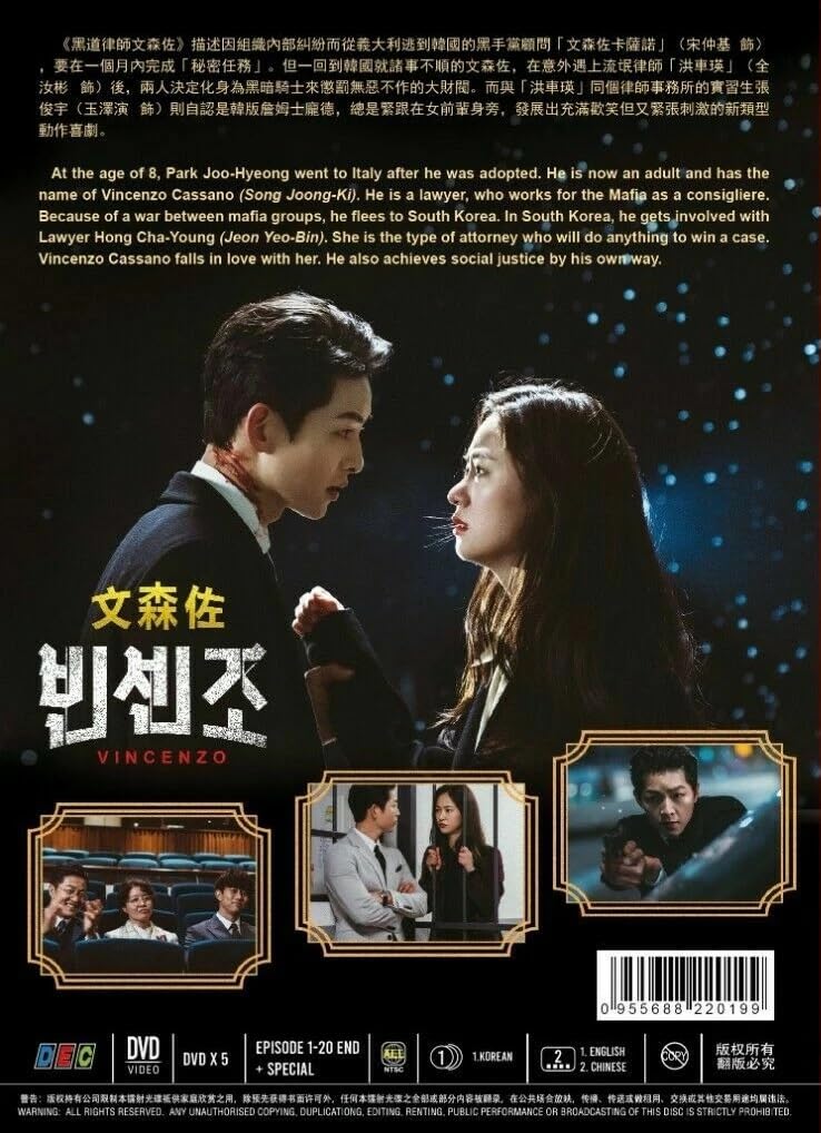 "At the age of eight, Park Joo Hyeong went to Italy after being adopted. Now an adult, he is known as Vincenzo Cassano to the Mafia, who employ him as a consigliere. Because mafia factions are at war with each other, he flees to South Korea, where he gets involved with Lawyer Hong Cha Young. She is the type of attorney who will do anything to win a case.".