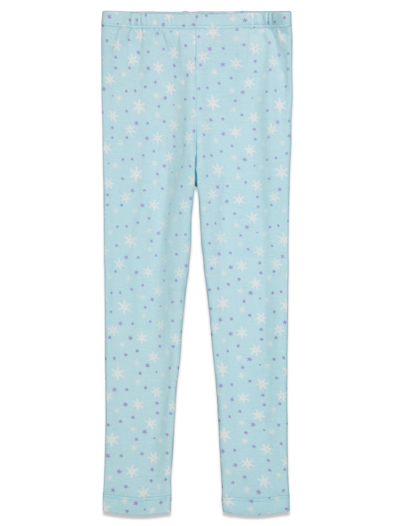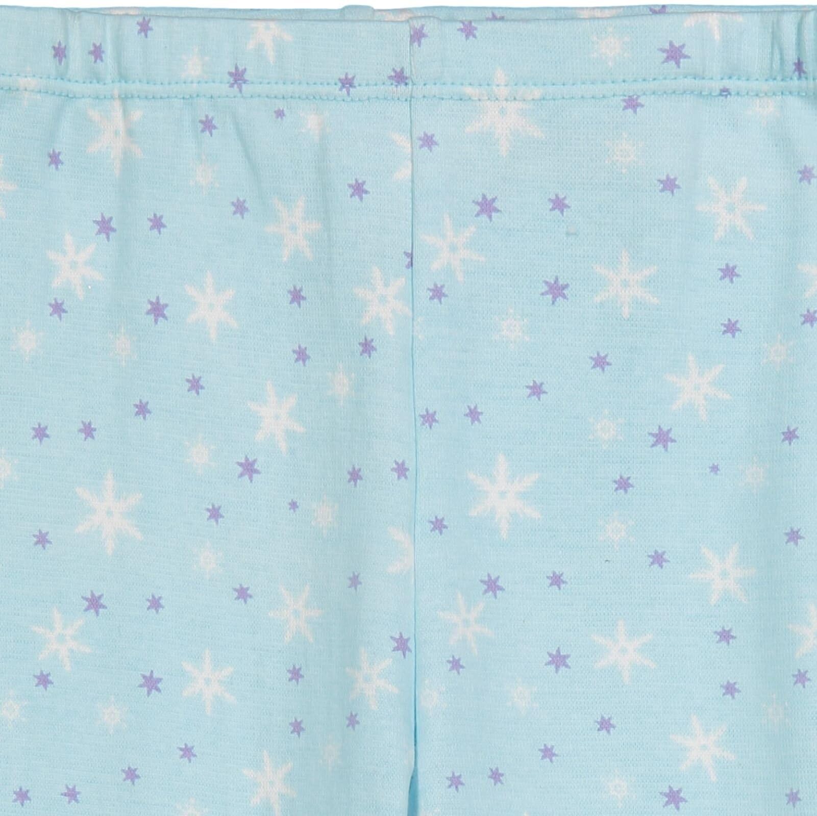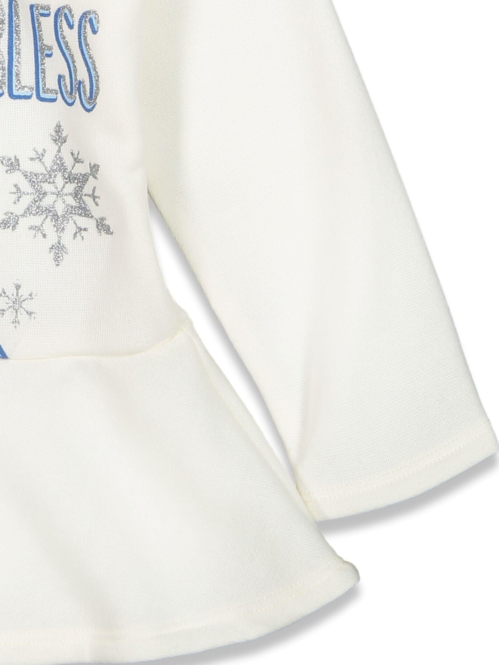 Ruffle peplum top with soft hand screen print artwork featuring Elsa with glitter snowflakes and the phrase "I am fearless," plus sky blue leggings with an all-over snowflake print.