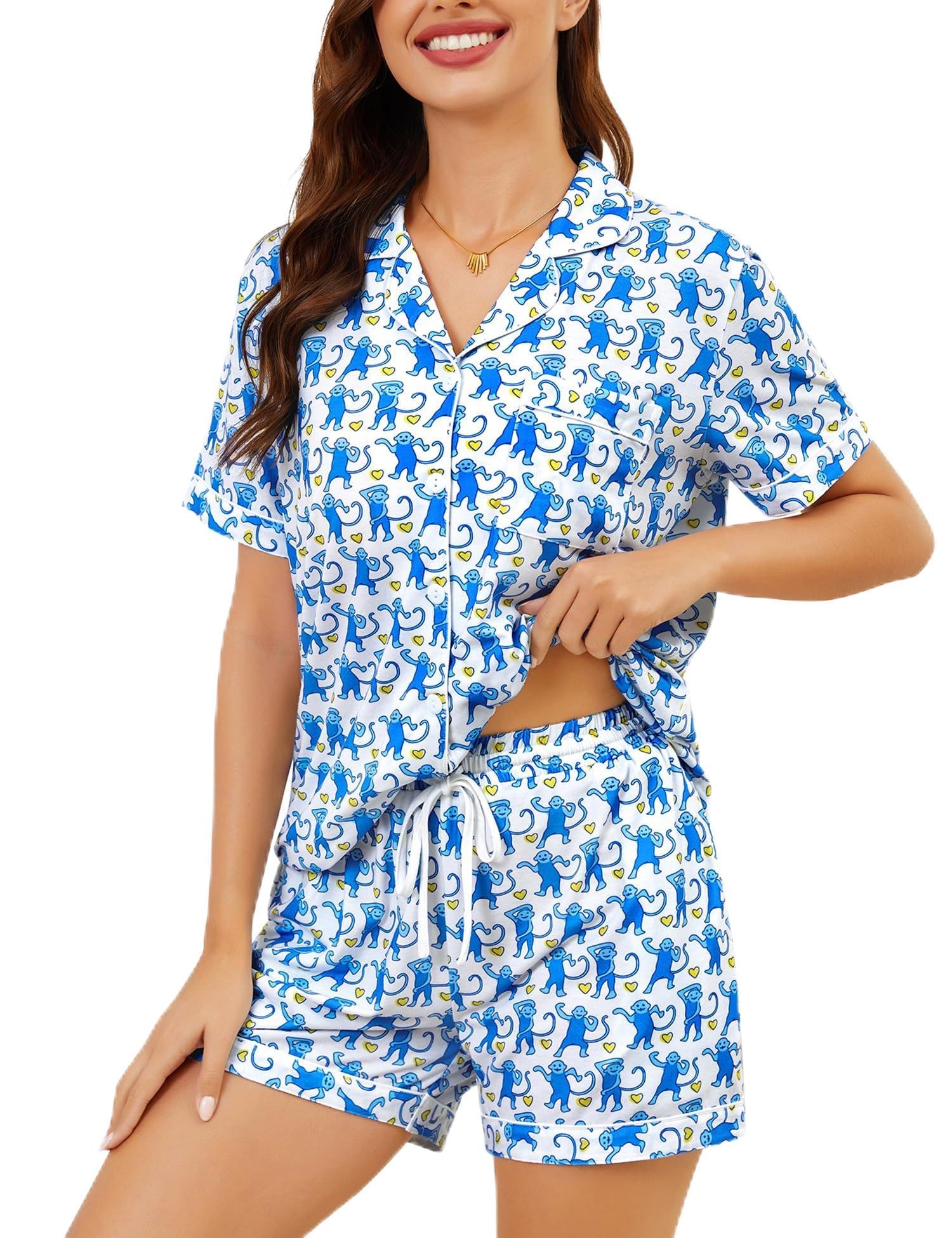 【DESIGN】 : This women’s pajama set with charming cartoon designs. Top features notch collar, button-front, and chest pocket, bottoms have with an adjustable drawstring waist and 2 side pockets for convenience.Stylish and functional, perfect for year-round ease.