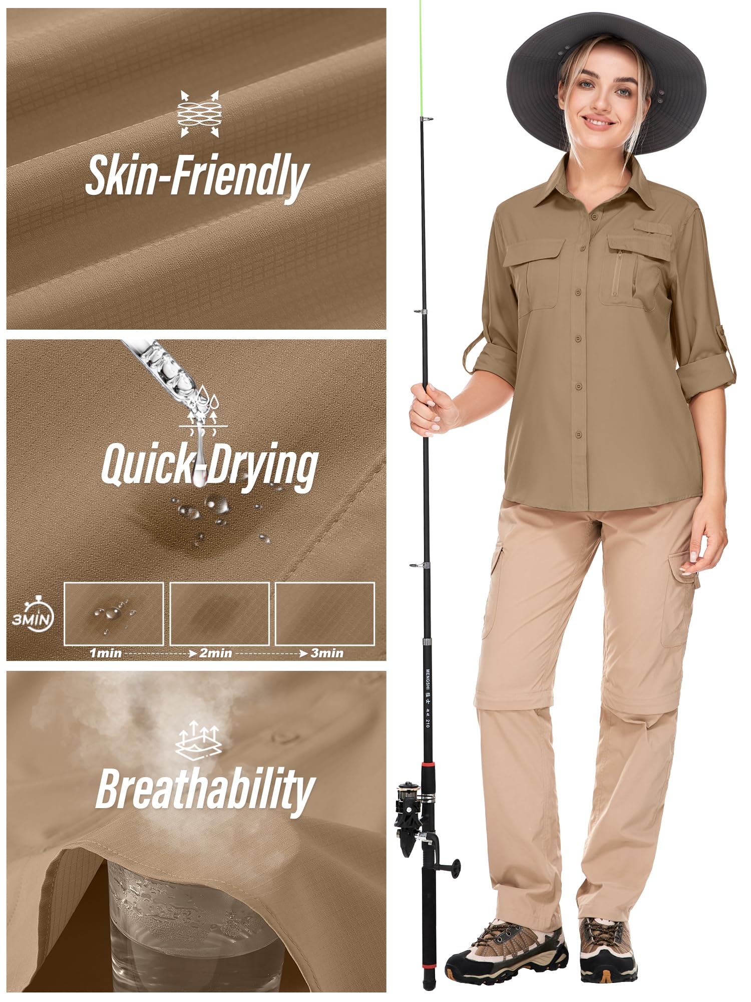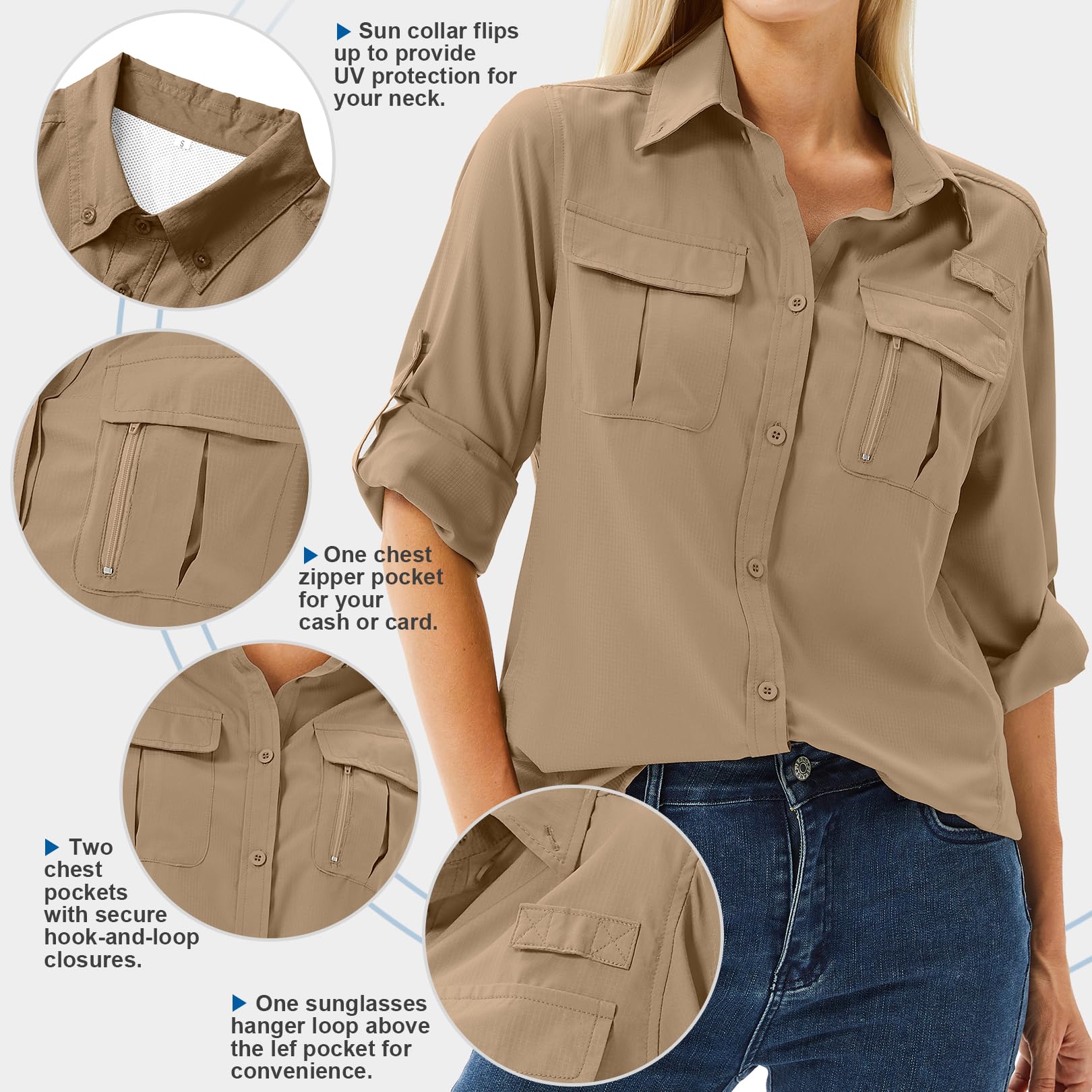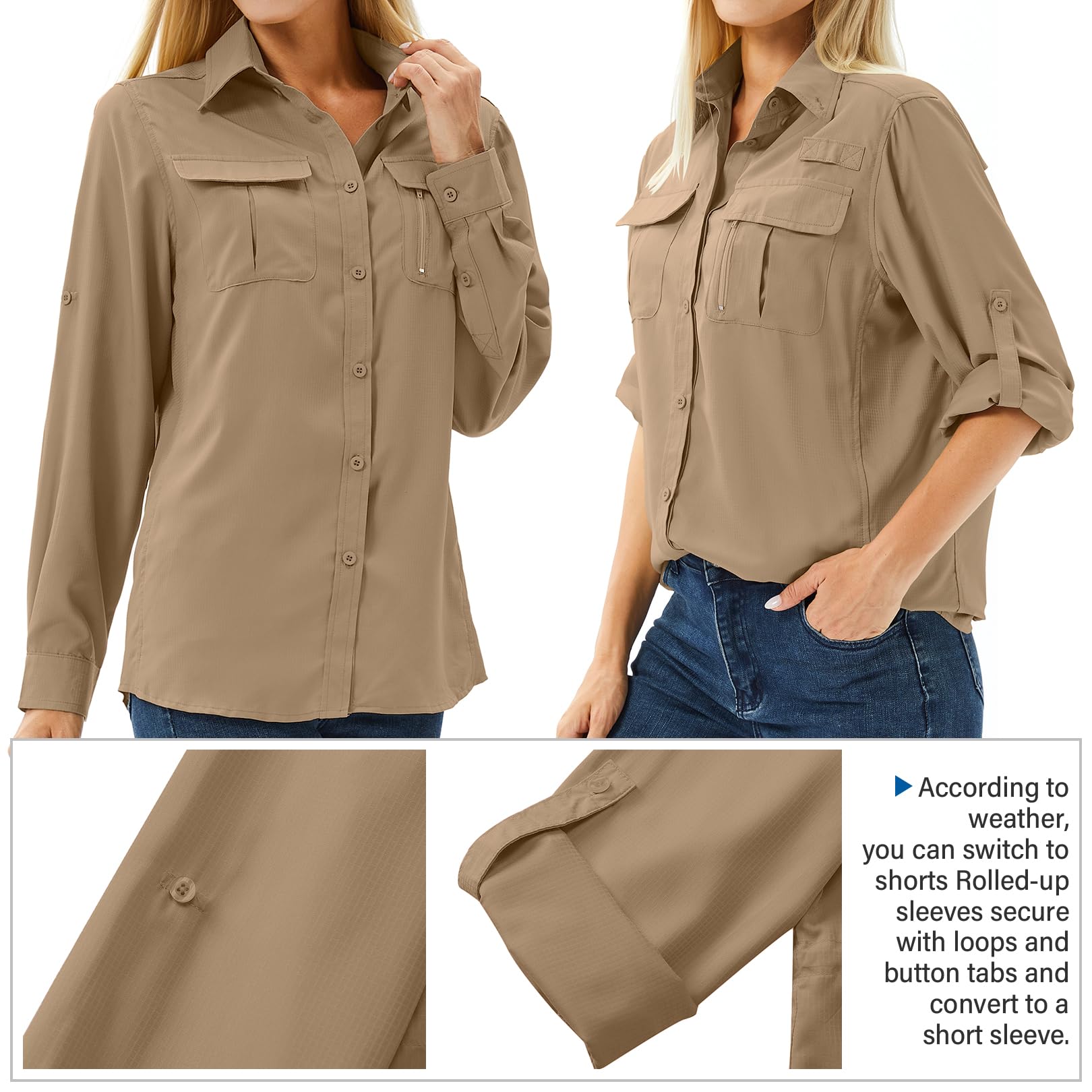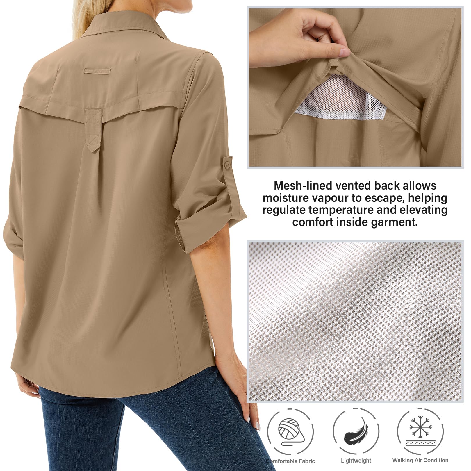 Long sleeve Hiking shirts:Women’s lightweight safari shirts features a mesh-lined vented back for breathability and comfort. Roll-up sleeves to convert long sleeves to short sleeves for hot days.