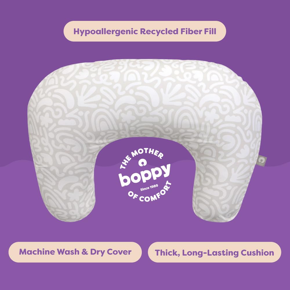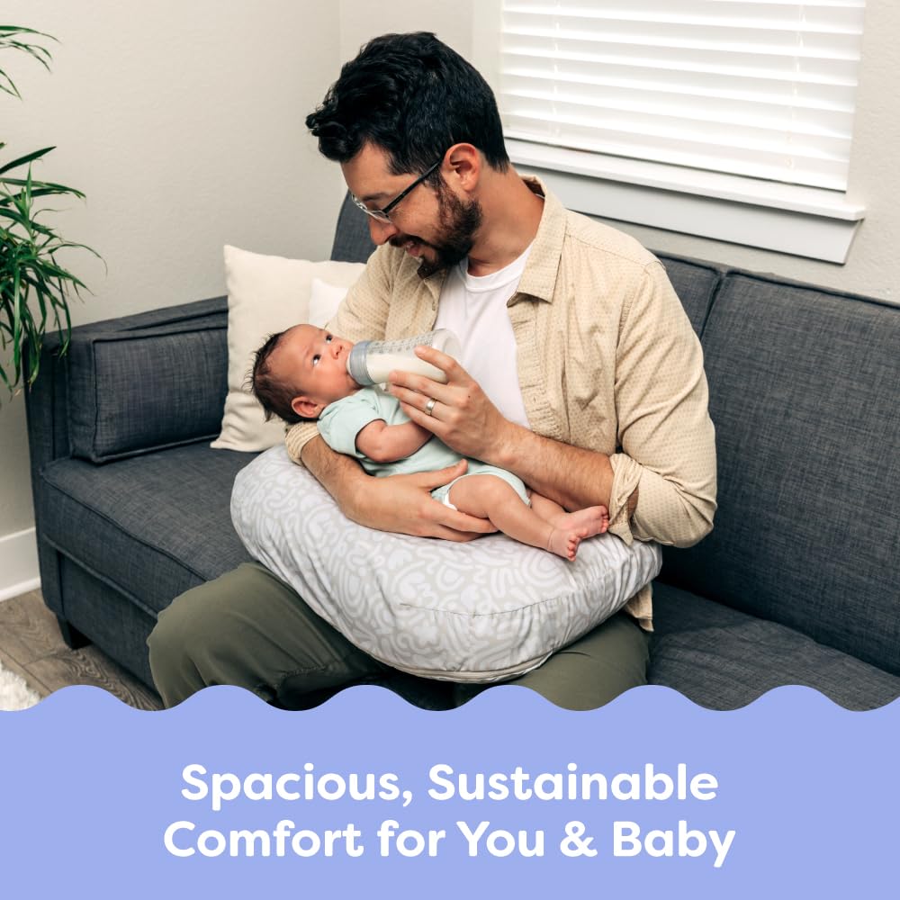 The flagship Boppy Nursing Pillow is designed to make feeding time more comfortable, supportive, and stress-free for both you and your baby. Its firm, ergonomic, patented design offers a higher surface to bring baby closer, reducing back, neck, and shoulder strain of parents during bottle or breastfeeding. The spacious, supportive surface helps position baby at the right height for a better latch in multiple feeding positions. Filled with hypoallergenic recycled fiber, it maintains its supportive shape over your entire feeding journey. A water-repellant liner and machine-wash, dryer-safe cover make cleanup easy, because spit happens! Trusted by parents and baby experts for over 35 years and verified by the Baby Safety Alliance, Boppy helped develop rigorous federal safety guidelines for nursing pillows, putting baby safety and parent comfort first, and ensuring comfort and confidence with every mealtime moment.