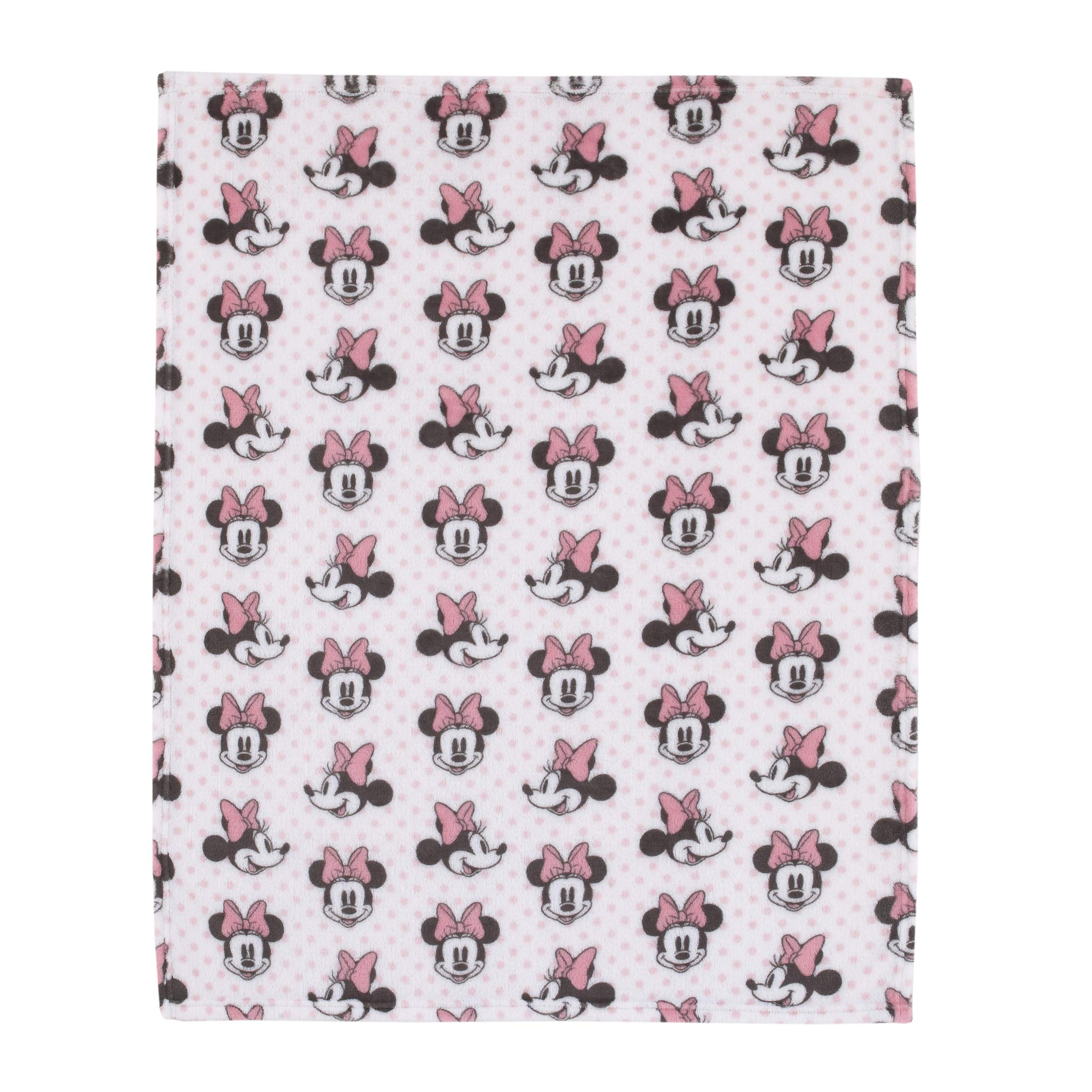 Everyone's favorite sweet and stylish Disney friend, Minnie Mouse, will complete the look of your little one's room on this adorable baby blanket! An ideal new baby or toddler gift, this super-soft blanket is constructed with a high-quality, French fiber fabric. Minnie's smiling face adorns the blanket in shades of black, pink and white that will easily coordinate with your child's room. This cute and cuddly Minnie Mouse blanket measures 30" x 36" so it is ideal for any age. Perfect as a room decor item or take with your child when you're on the go!