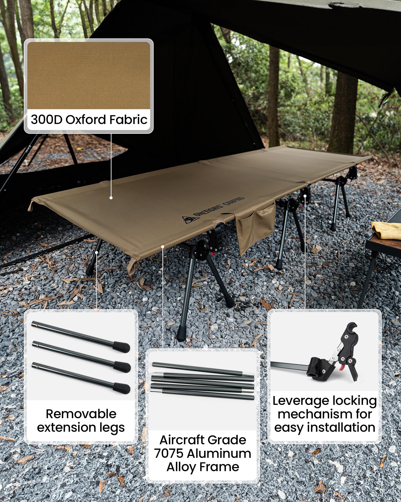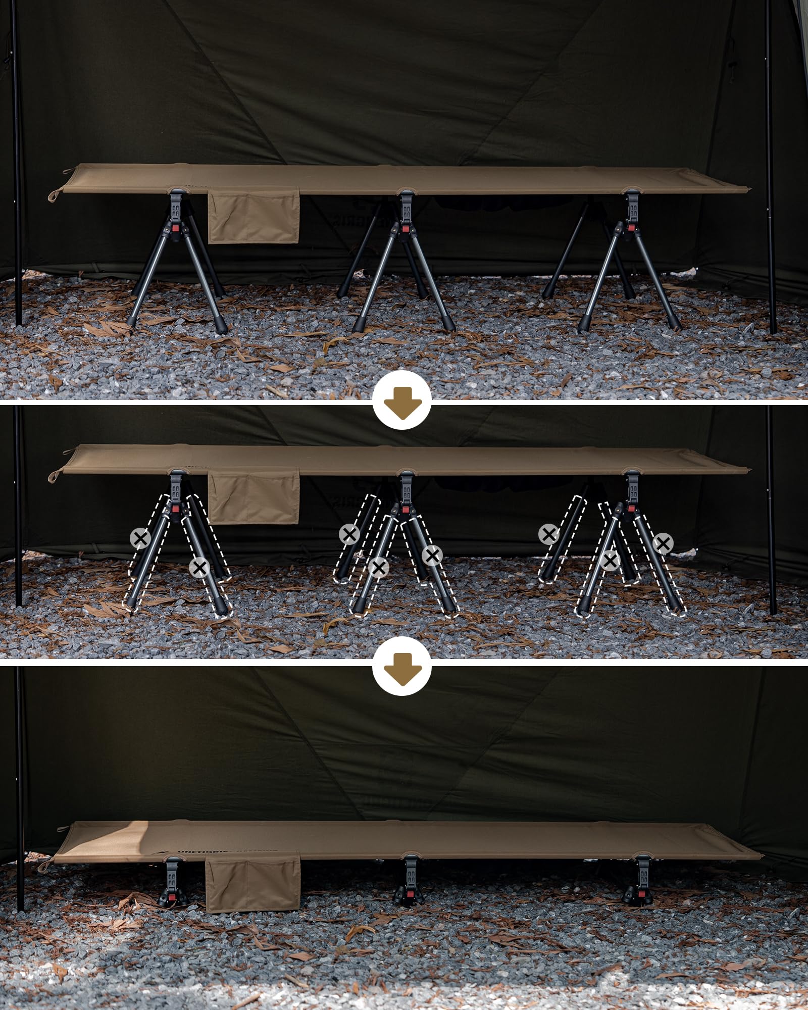 ★ 𝙃𝙚𝙞𝙜𝙝𝙩 𝘼𝙙𝙟𝙪𝙨𝙩𝙖𝙗𝙡𝙚 - Our camping bed provides 2 height options with the 12 extending legs, 15.75" (40cm) for a higher heigh, perfect to use on grass or muddy/ damp ground, or as a bench to sit on; Lower 5.9" (15cm) height to use as a tent cot or on solid ground, save your back from sleeping on the rough or cold/ wet ground for the best outdoor sleeping experience