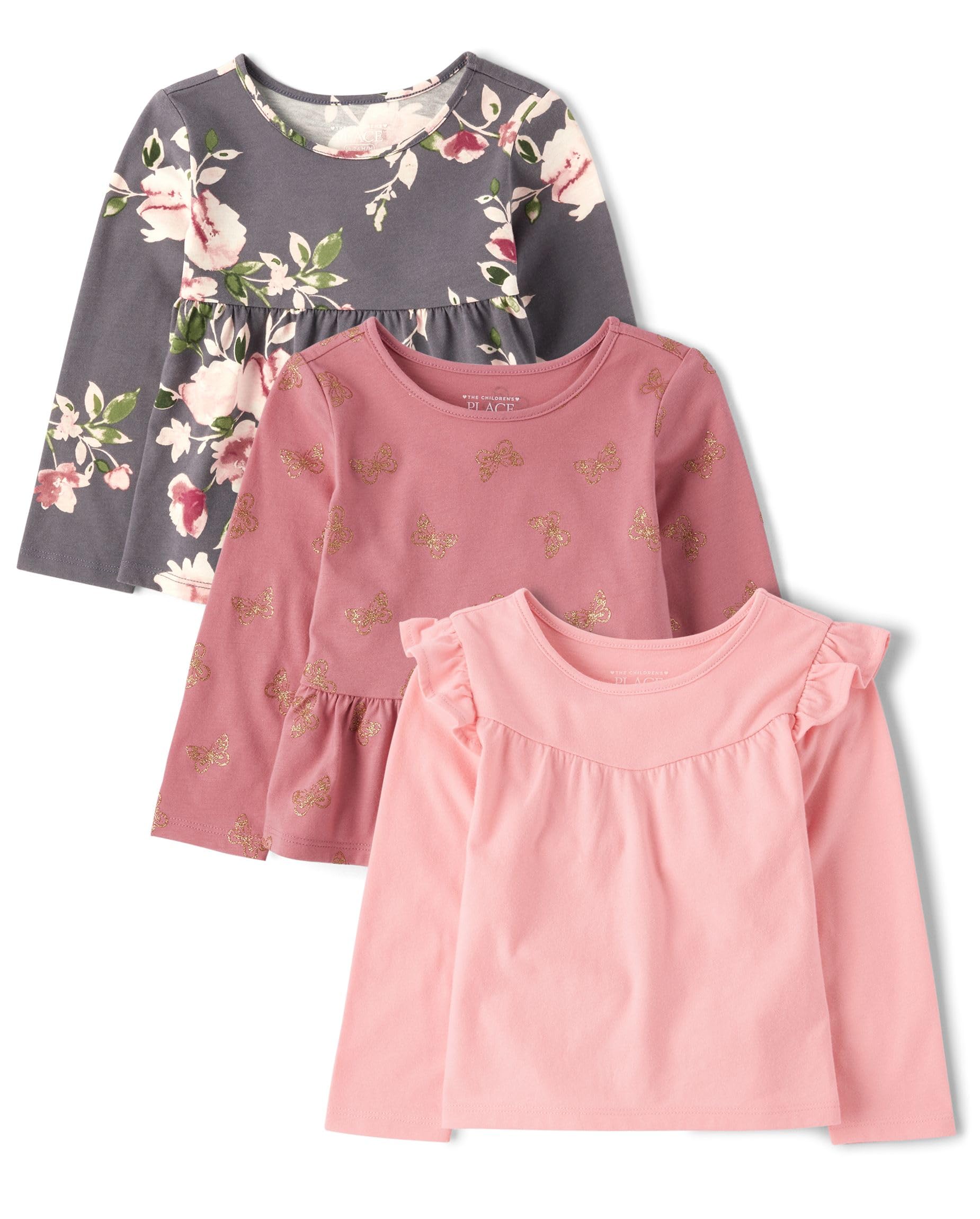 MULTIPACK: 1 bouquet graphic design with ruffle trim at drop shoulders, 1 solid with peplum hem, 1 floral print with peplum hem