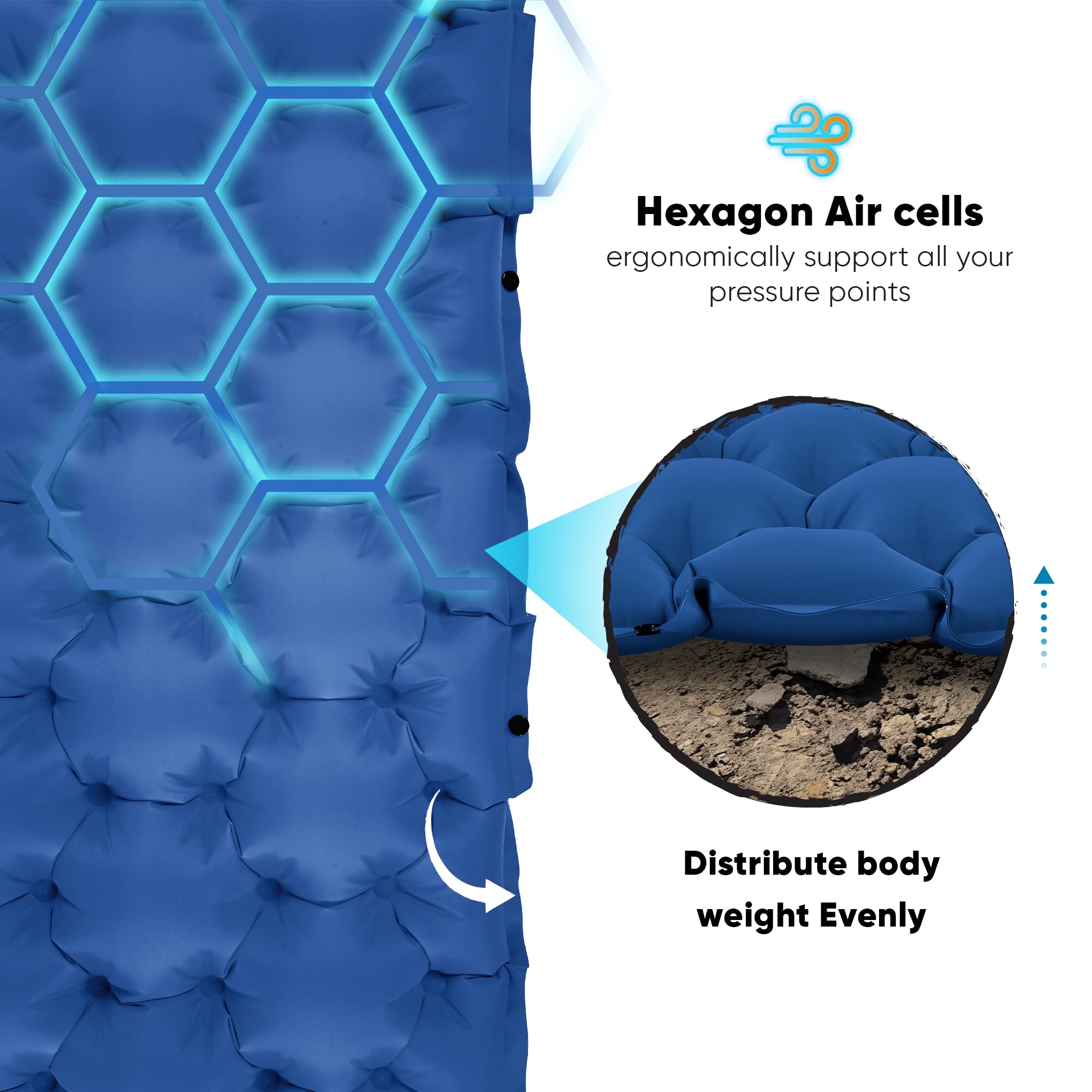 Sleep Soundly All Night Long: The hexagon air cells and one-piece pillow ergonomically support all of your pressure points, delivers superior support and comfort all night long, no matter how you sleep – on your side, stomach or back! This comfy sleeping pad for camping 2 person is also a camping gear must haves luxury, being comfortable yet lightweight. It's super versatile, an ultralight camping sleeping mat, 2 person cot, tent carpet, car mattress, picnic mat etc, works perfect for family or couple camping trip.