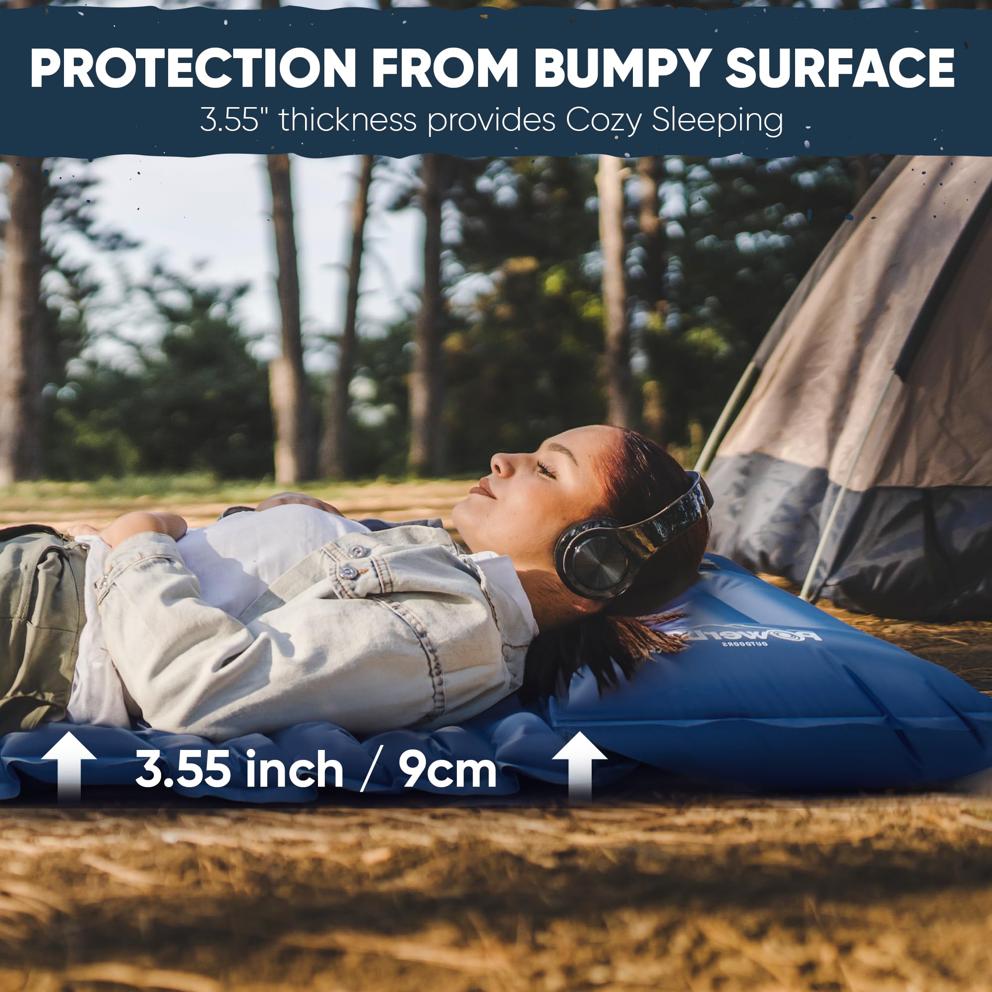 3.55‘’ Thickness Double Sleeping Pad: 3.55 in. (9 cm) thick pad with sleeping surface for all-night cushioned comfort; 49.2 in. (125 cm) larger pad keep you in the middle of the pad. 77.2 in. (196cm) long suit for your camping tent. The 2 person camping mattress designed with larger & thicker size enough for 2 tall and large adults. The camping mat's lightweight construction, weight at 3.13lbs and folds smaller to 12.2x5.5 inch to save space in your backpack, compact roll-up design make it easy to carry and store.