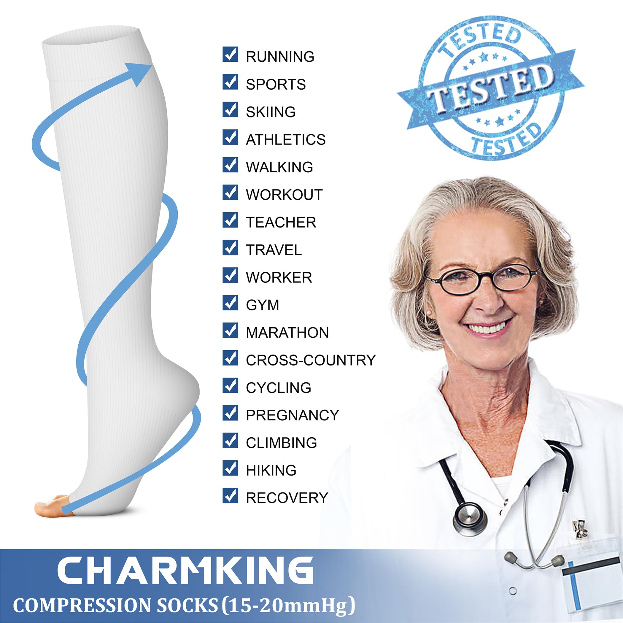EFFECTIVE - Our compression socks (15-20 mmHg) are highly recommended by preferred by trainers. These are designed to promote blood circulation and oxygen flow preventing fatigue and helps in muscle recovery. Whether you are an athlete, teacher, flight crew, receptionist, office worker, pregnant, nurturing mother, elderly, our socks are universally suitable for all work.