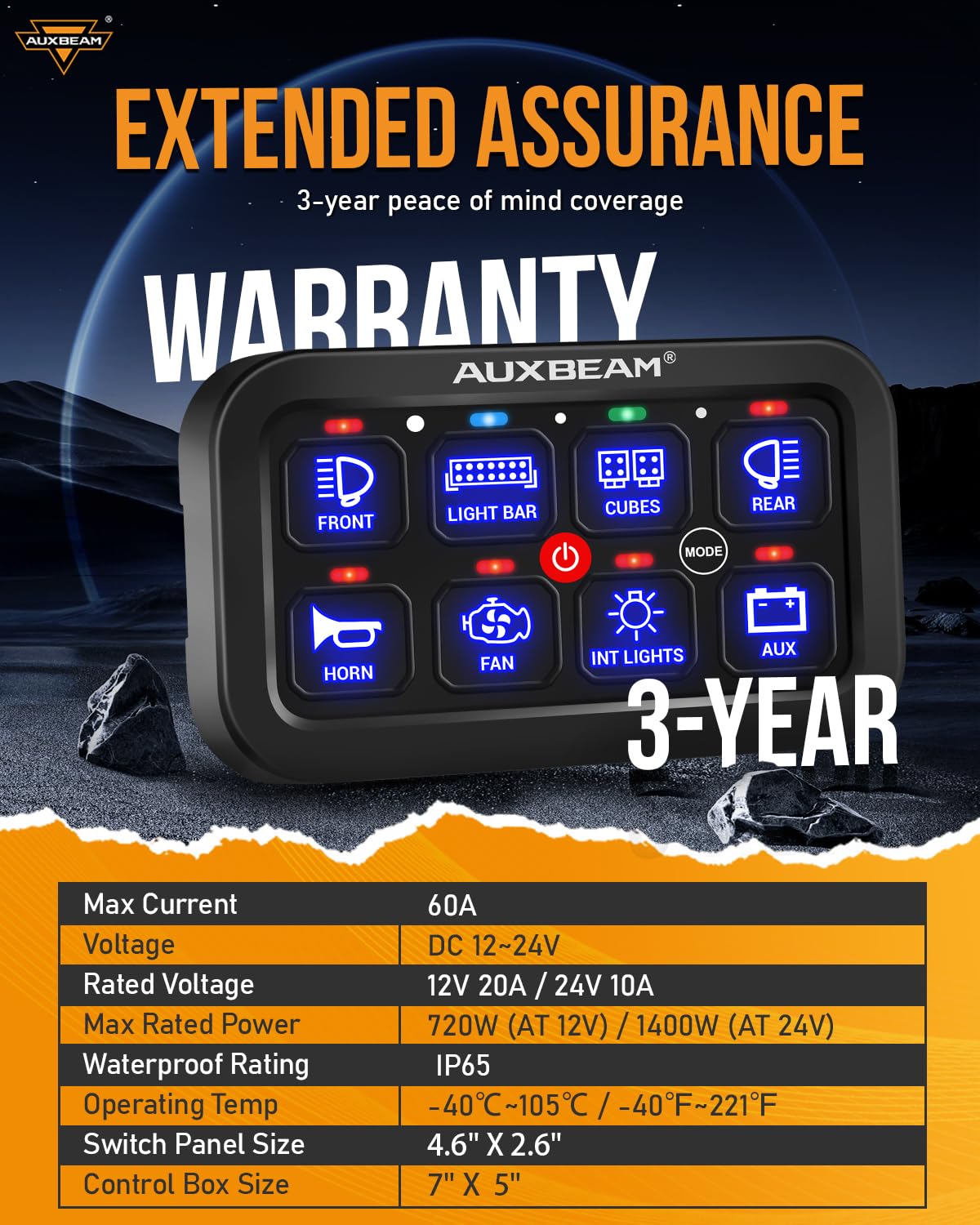 Applicable: The 8 gang RA80 switch panel is universally compatible with all 12-24v vehicles, including cars, trucks, off-road vehicles, boats, SUVs, pickups, RVs, and more. It is backed by a 3-year protection from Auxbeam