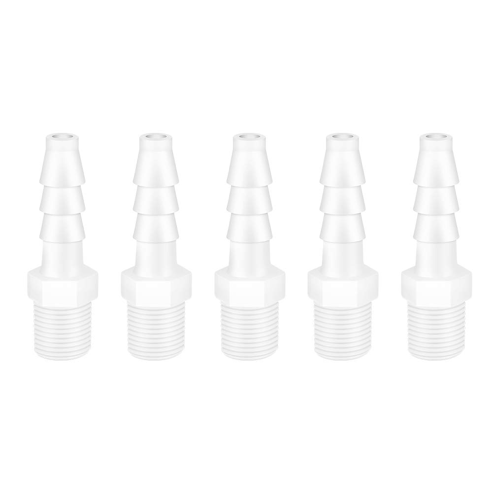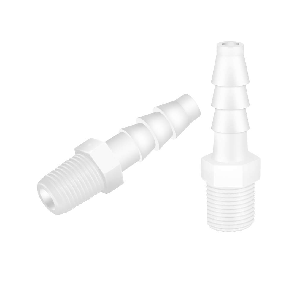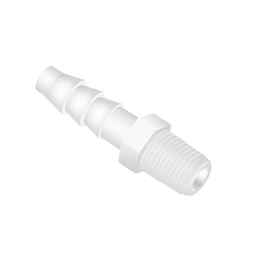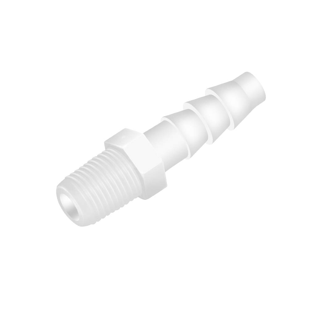 Barbed fitting creates a tight seal on flexible and semi-rigid hose when used with a hose clamp or crimp sleeve or ferrule.
