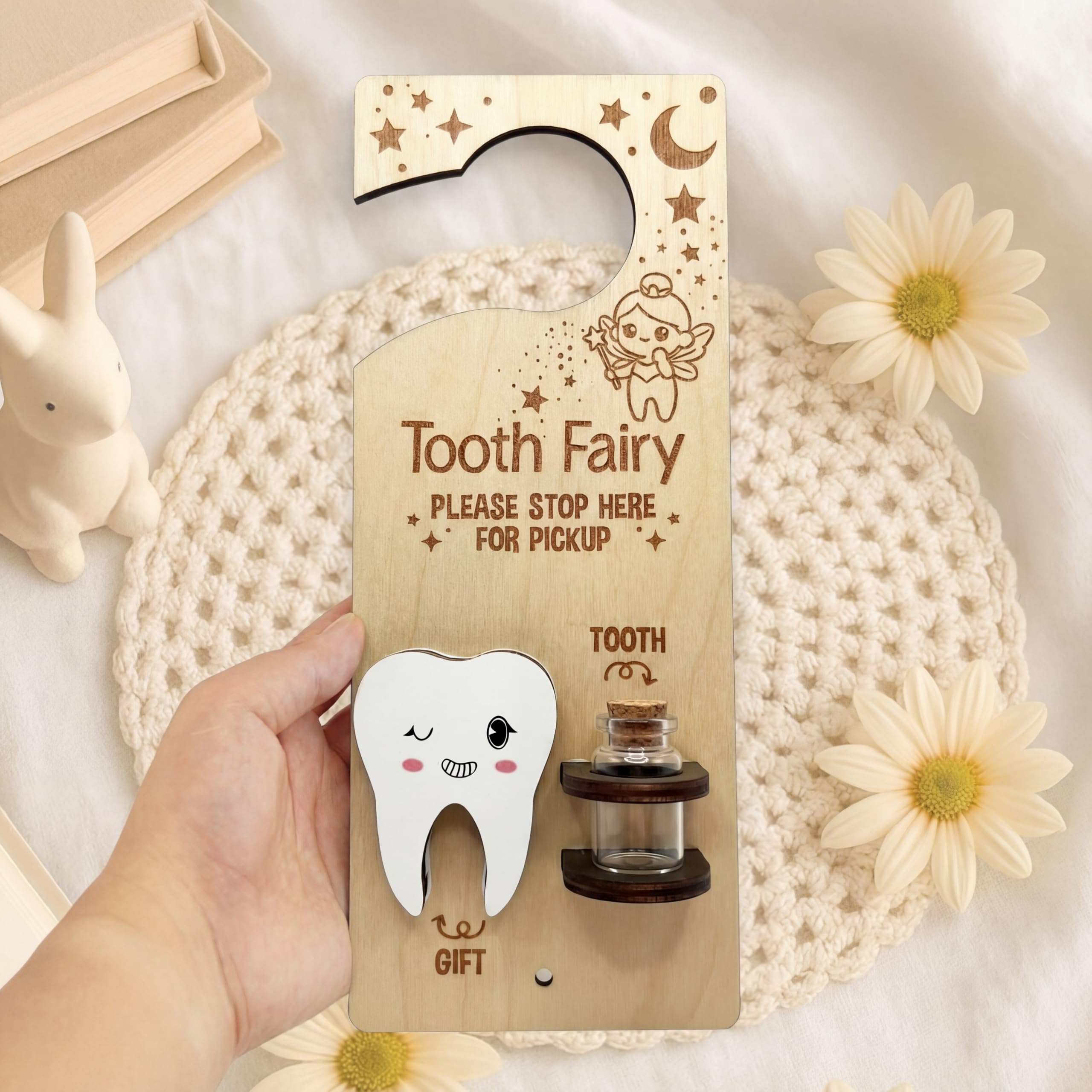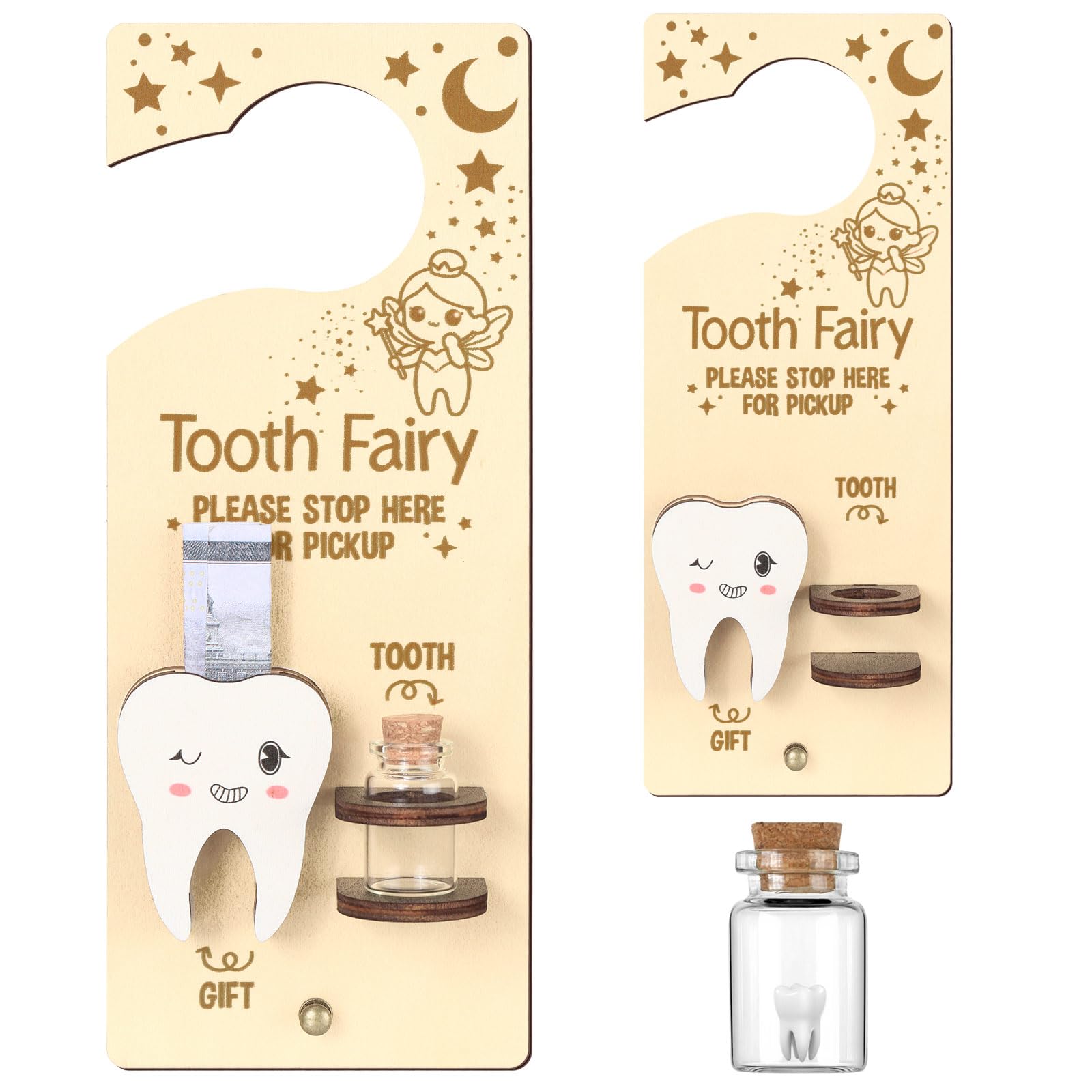 Durable Material Construction: this tooth fairy door hanger is made from wood material, offering durability and strength; Offering an exquisite feel while ensuring the safe storage of your child's precious teeth; The bottle is made from glass and features a wooden cork, contributing to the set's overall classic design