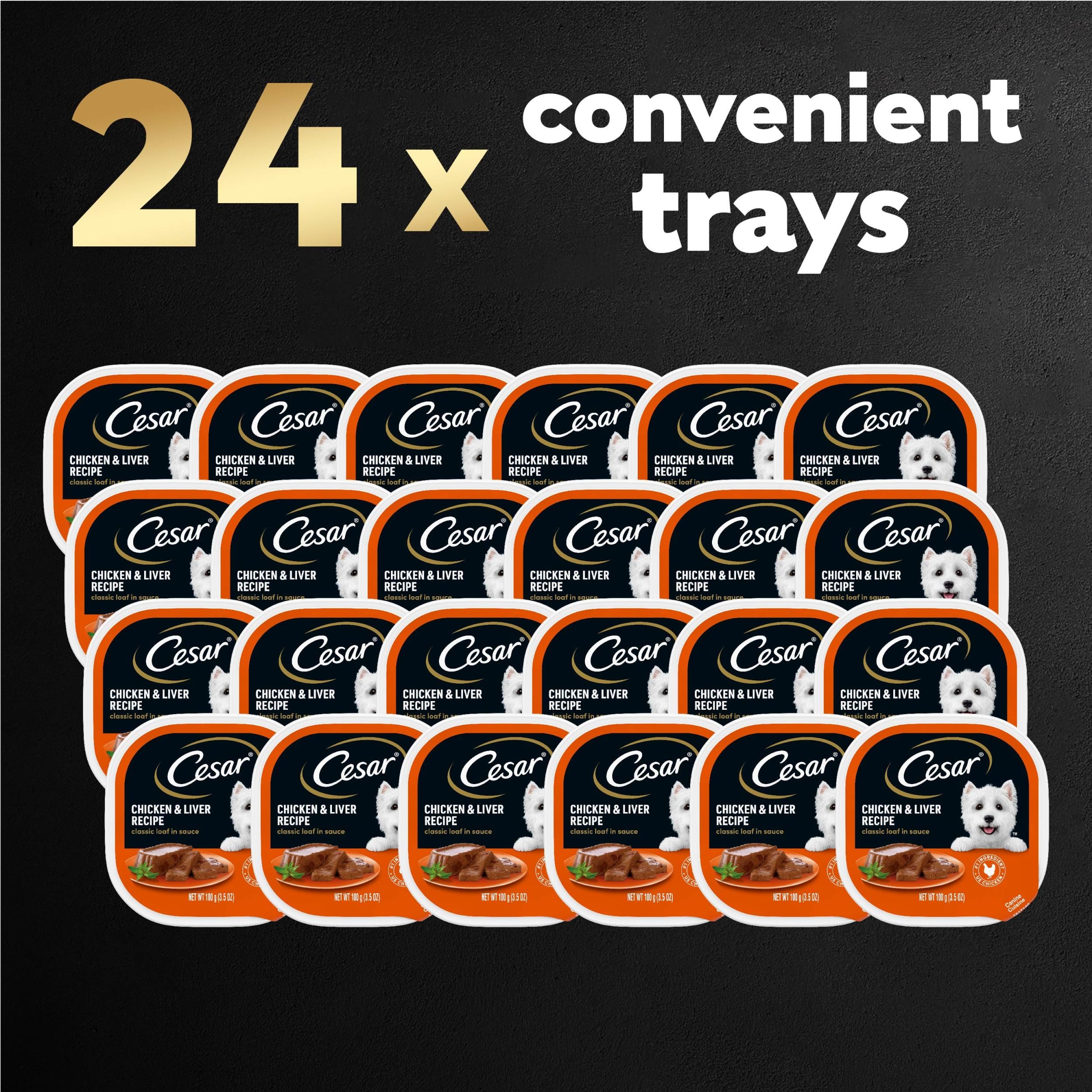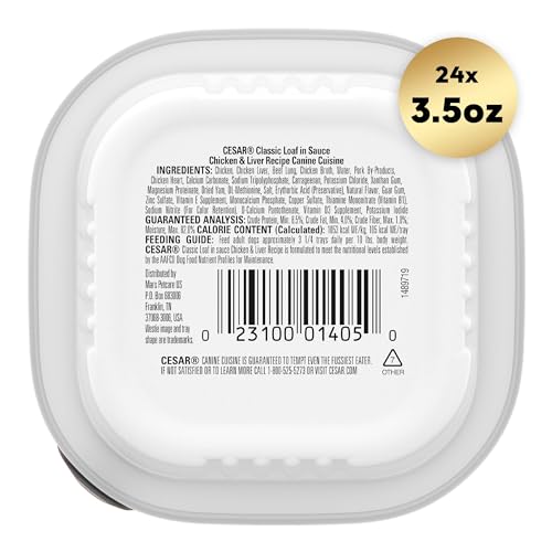The Cesar brand knows that the best way to show your dog love is by keeping them happy and healthy with gourmet meals. With chicken as the #1 ingredient, Cesar Wet Dog Food Classic Loaf in Sauce Chicken and Liver Recipe gives your dog great flavor and a delicious meal. This product contains no fillers, no artificial flavors, and is formulated without grains*. Made in the USA with the finest ingredients from around the world, you can be sure your best friend is getting a high quality meal. This gourmet soft dog food is also served in convenient trays with easy peel away seals. Thanks to Cesar, you can give your dog a healthy meal that they will love and love you for (*Trace amounts may be present due to cross-contact during manufacturing).