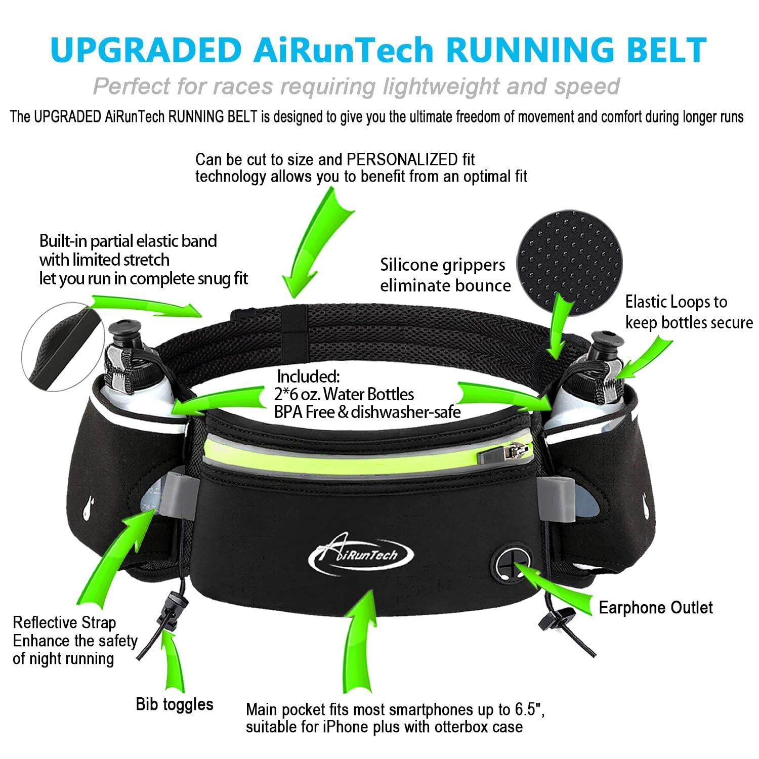 AiRunTech is a US brand focusing on products assisting to the people who are fond of running, cycling, swimming, snow skiing, and other outdoor activates etc. AiRunTech prioritizes on ensuring excellence in Quality, Eco-friendliness and utmost comfort. Organized by a young team, AiRunTech is committed to source premium quality products for you and keep improve the products. Our products are designed to help you enjoy sports with greater comfort, convenience, and style. STORAGE & PROTECTION Fit for Apple iPhone series,Huawei, Samsung Galaxy Note,Sony and most smartphones.The running belt is also perfect for credit cards, ID, keys, paper towel, bars choc, energy gel packs, running accessories, etc.With zipper closure,keeps your valuable belongings secure inside.Keep your hands free and avoid pickpockets while on the go. FRICTION-FREE COMFORT AiRunTech running water belt is made of high quality, lightweight,durable,soft Neoprene material, with anti-slip design, adjustable hook&loop tape strap waistband allows for a snug fit that stays in place without bouncing or chafing during use. Easy for buckling and comfortable for wearing. EXCLUSIVE HEADPHONE HOLE How can there be no music during exercise, the opening for earphone wire let you can enjoy music even when the running bag is closed. FULLY ADJUSTABLE long enough to accommodate plus size, but is also easily cut for people with slimmer builds, give you the ultimate freedom of movement and comfort, personalized fit for waist from18 - 51.2 inches(46cm-130cm) . VERSATILITY & SAFETY Two 175ml BPA-free water bottles allow you to easy access to hydration and nutrition.Design of 2 removable race bib strap toggles can hold your race number for triathlons, marathons or running race. Reflective tabs on the front of the pocket are for high visibility, keeping you more safely when running or walking.