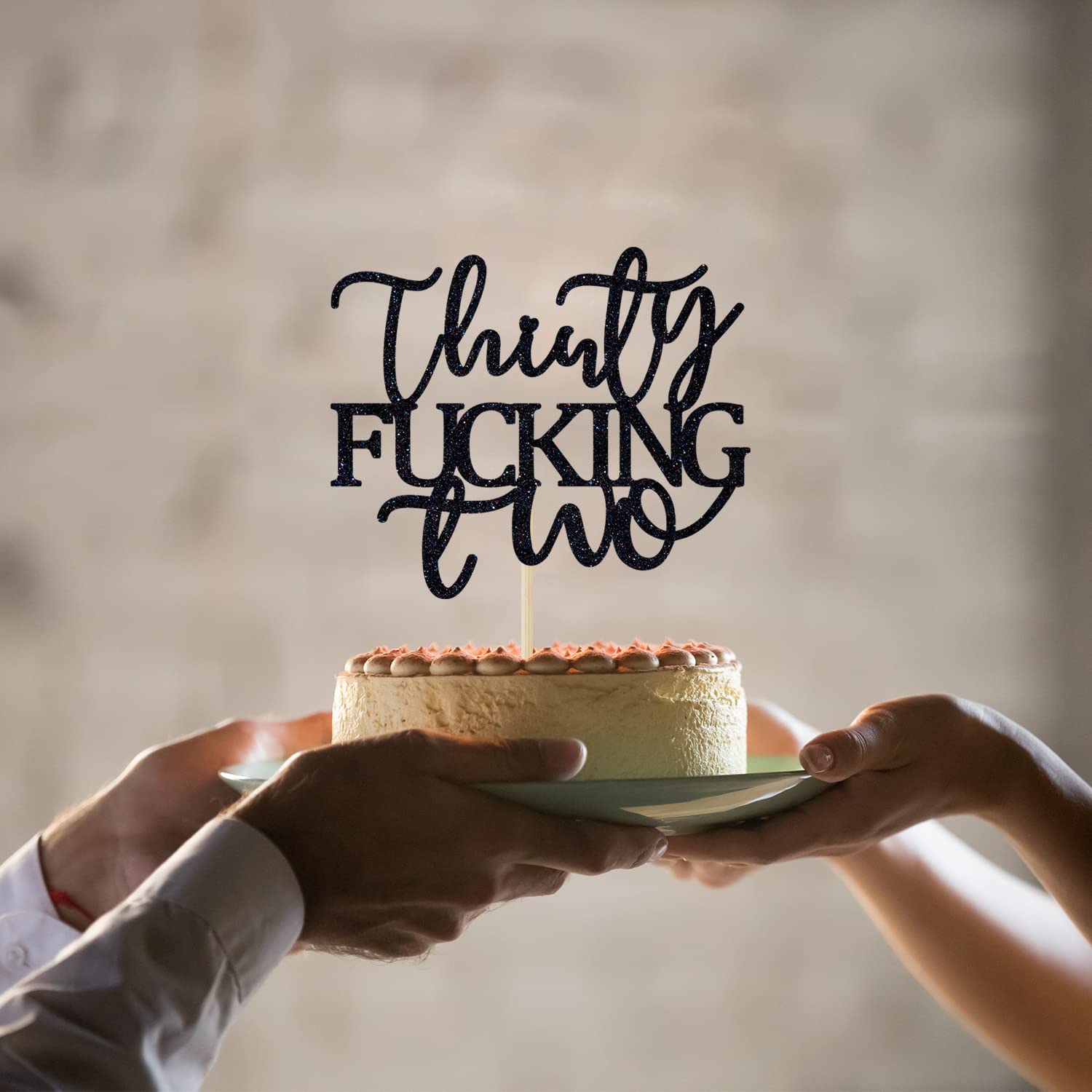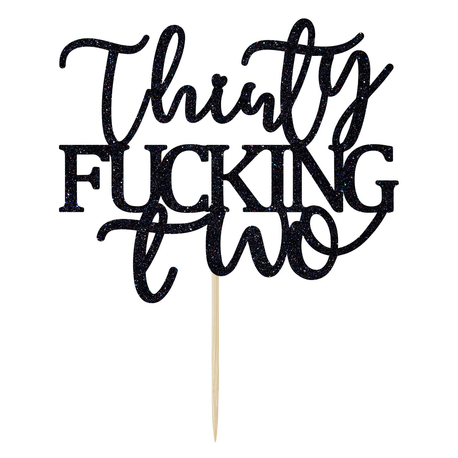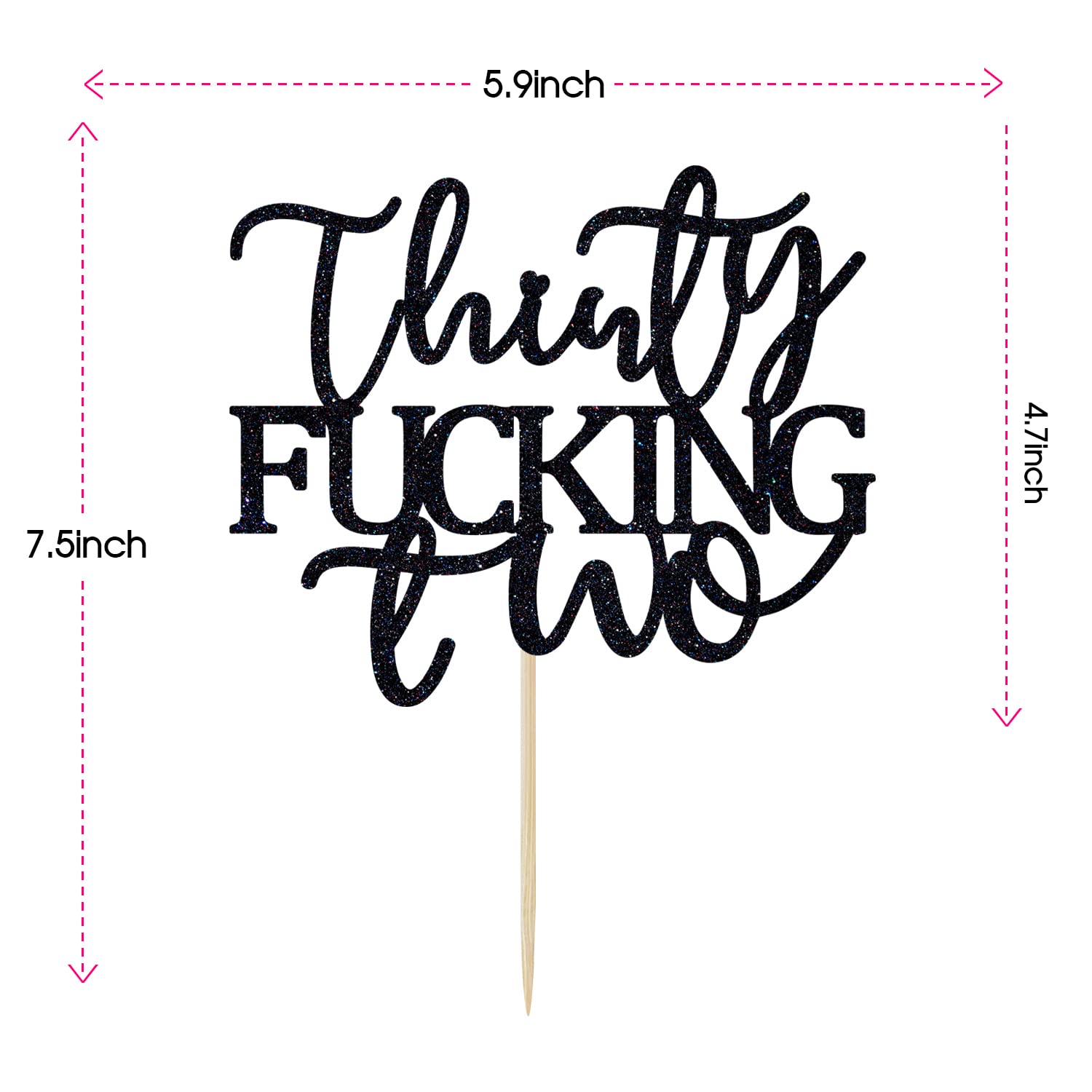 [ Package Include ] 1 PCS Thirty Fucking Two Cake Topper [ Notes ] 1, The cake topper is not edible! Don't put this product in your mouth! 2, The toothpick is sharp, please don't let children use it alone! 3, The cake topper is made of cardboard, so it is not washable. 4, Picture may appear larger on your screen, color may vary slightly due to the color setting of each individual monitor.