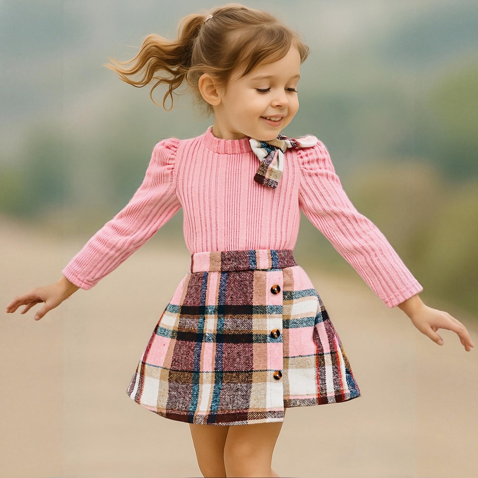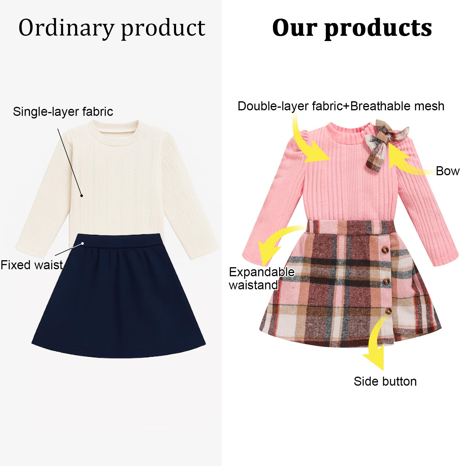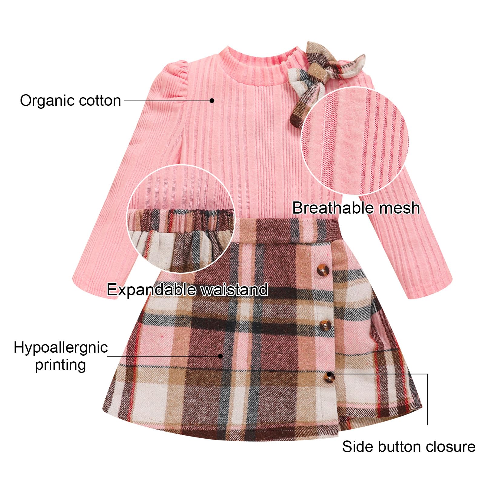 MATERIAL: Toddler girl shirt sweater top is made of cotton and polyester, bottom skirt is made of cotton blend and polyester, soft, breathble, and comfortable, sweet toddler baby girl 2 piece skirt set, cute baby girl clothes.
