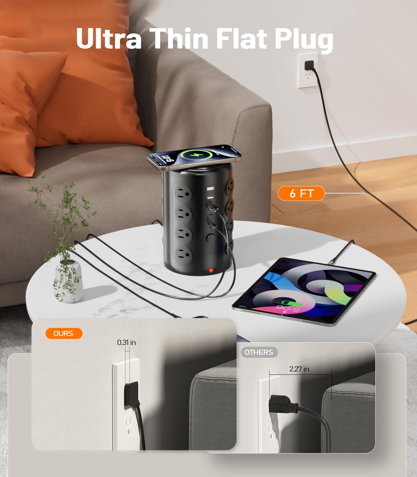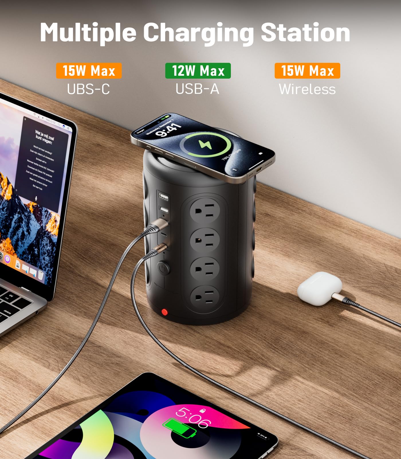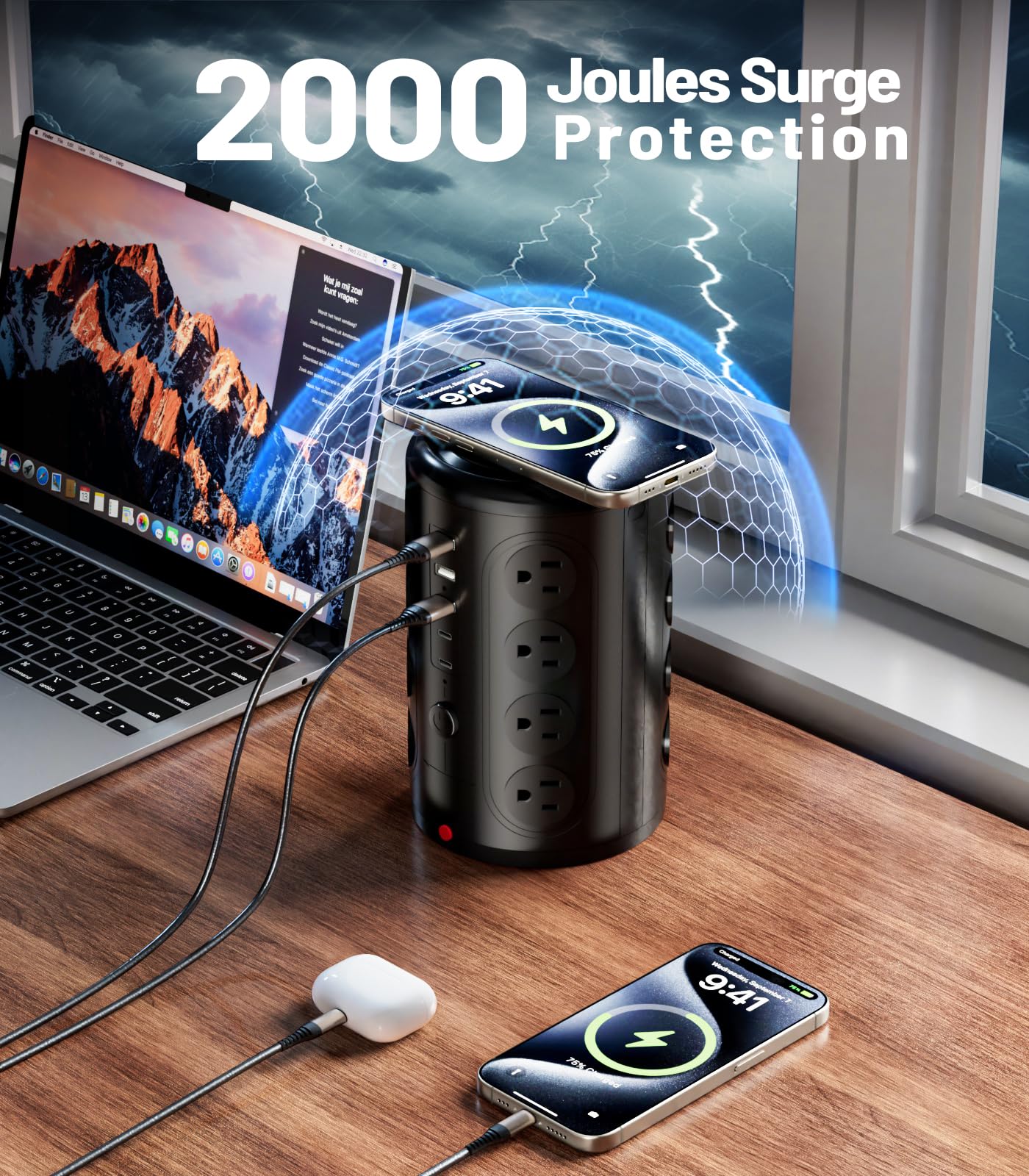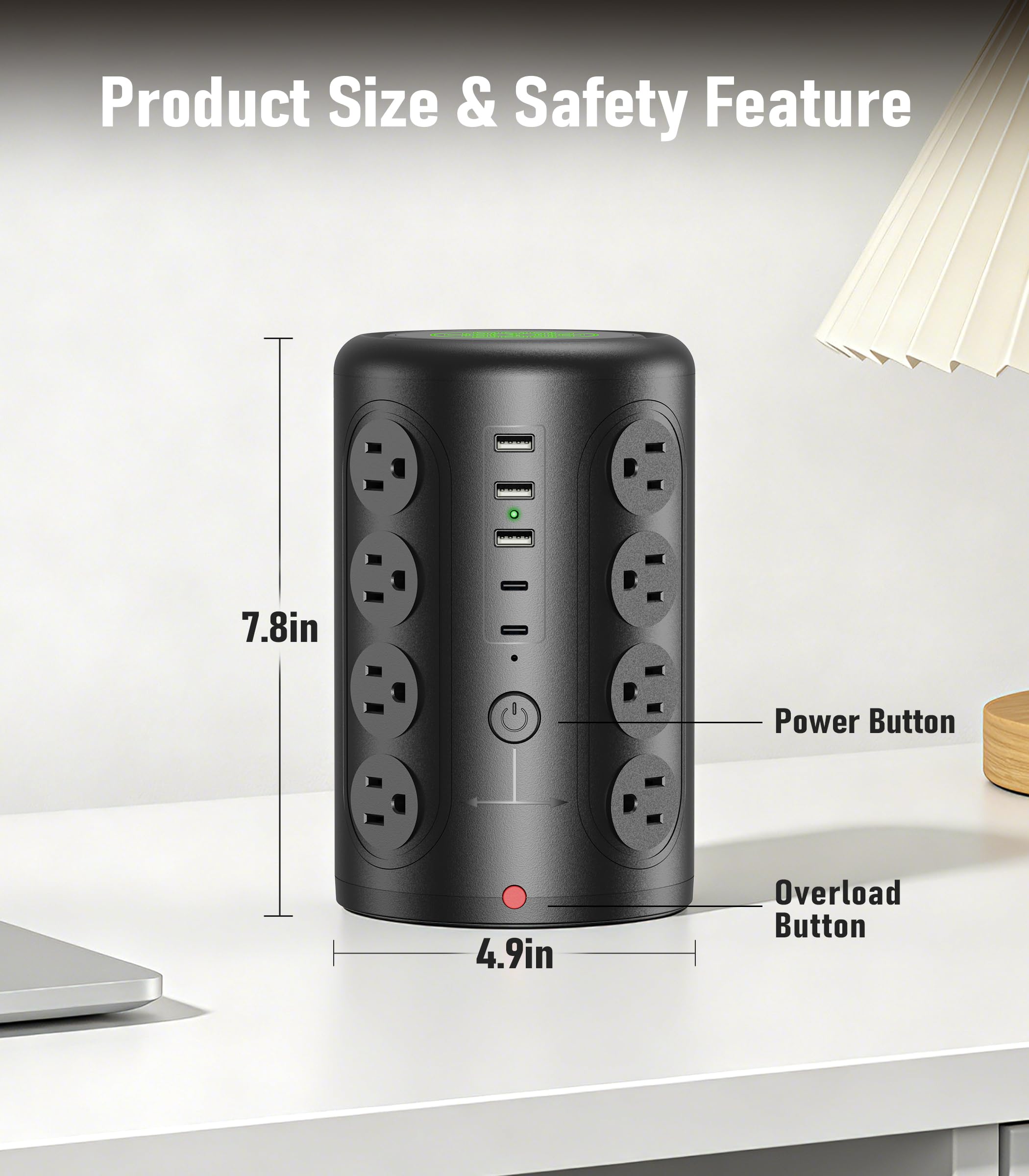 【Ultra-Safe Charging Station】 The built-in 1875 watts circuit breaker and 1500 joules surge protector safeguard your electronics while triping or lightning.