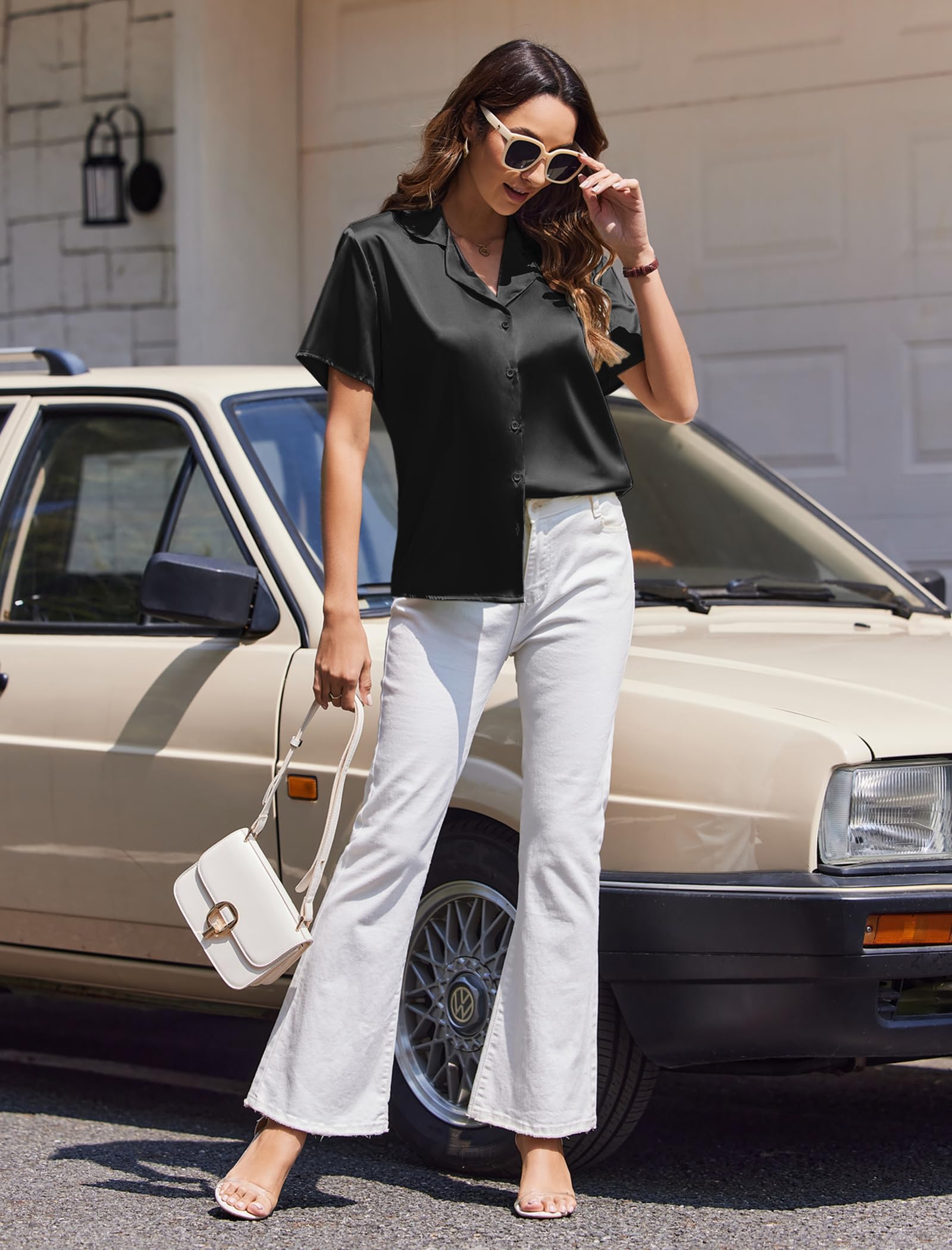【Unique Fashion Designed】: 2 Piece Satin Pajama Set Featuring Relaxed Style, Short Sleeve, Classic Notch Collar, Full Button Design is easy to put on and take off. Cute Print Pj Set With Elastic Waist Contrast Trim Pajama Shorts will give you more comfortable and freendom feeling when you wear it.