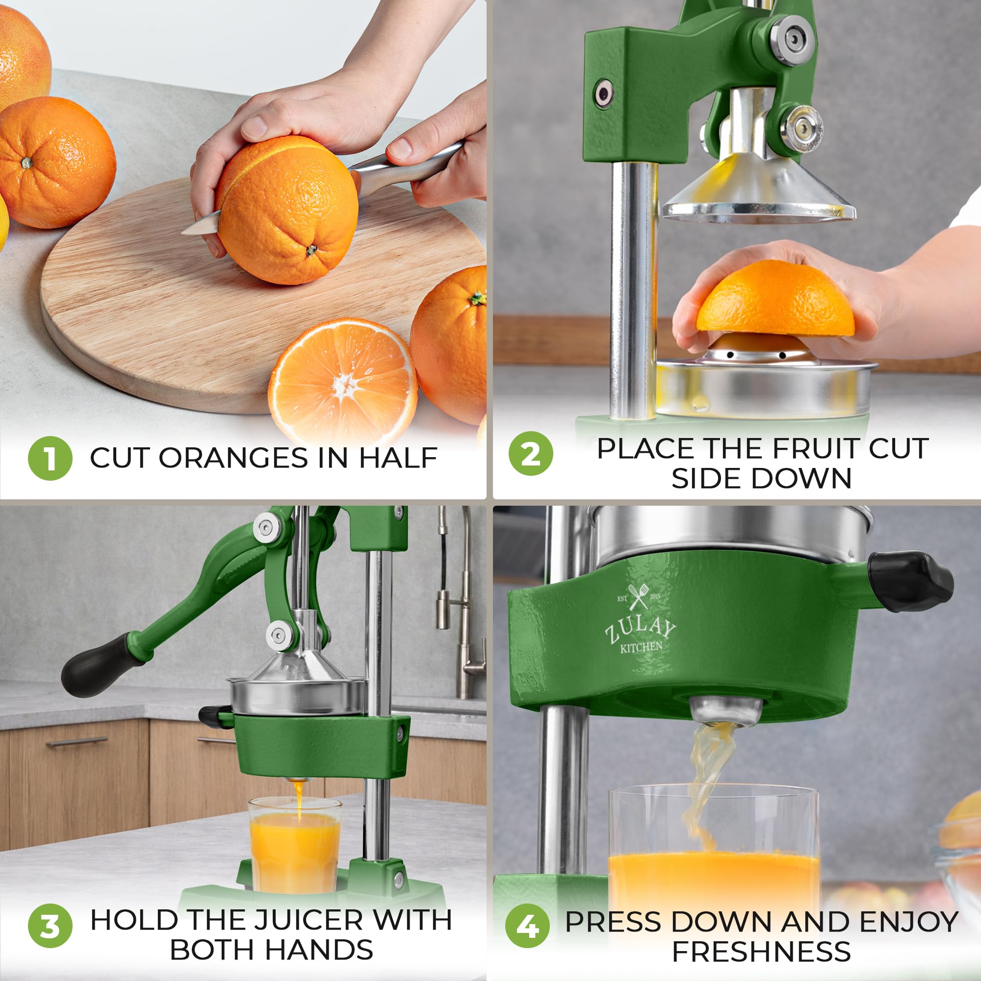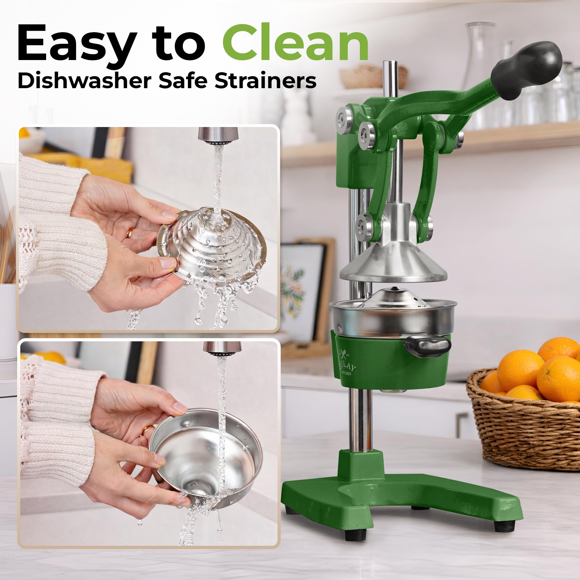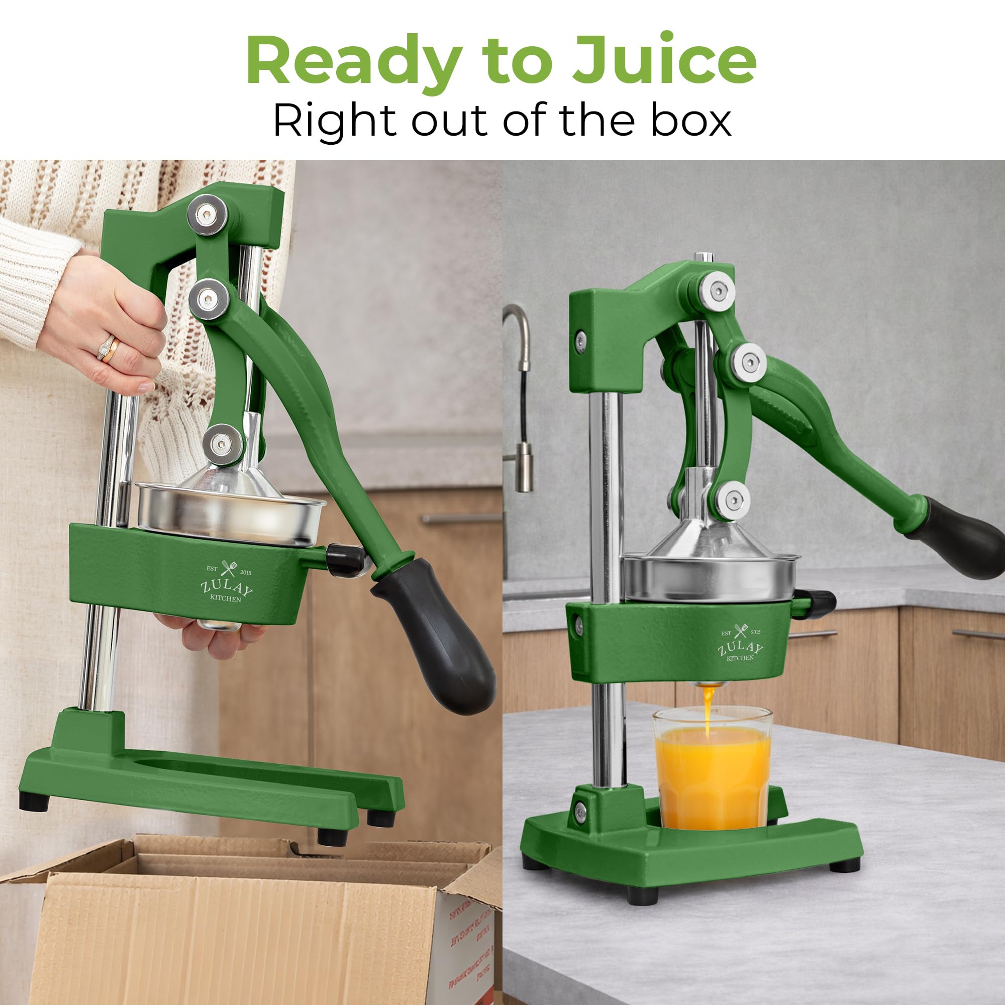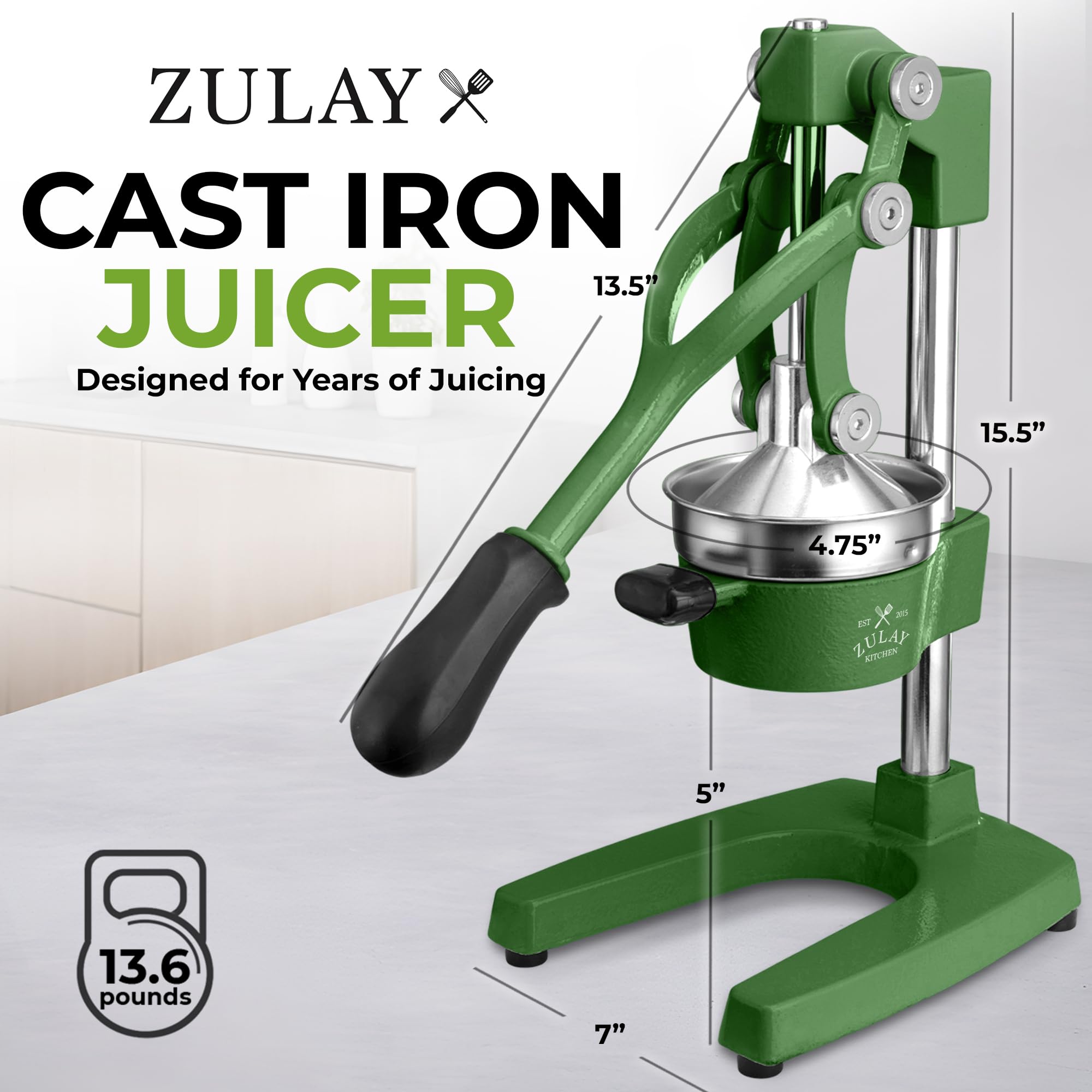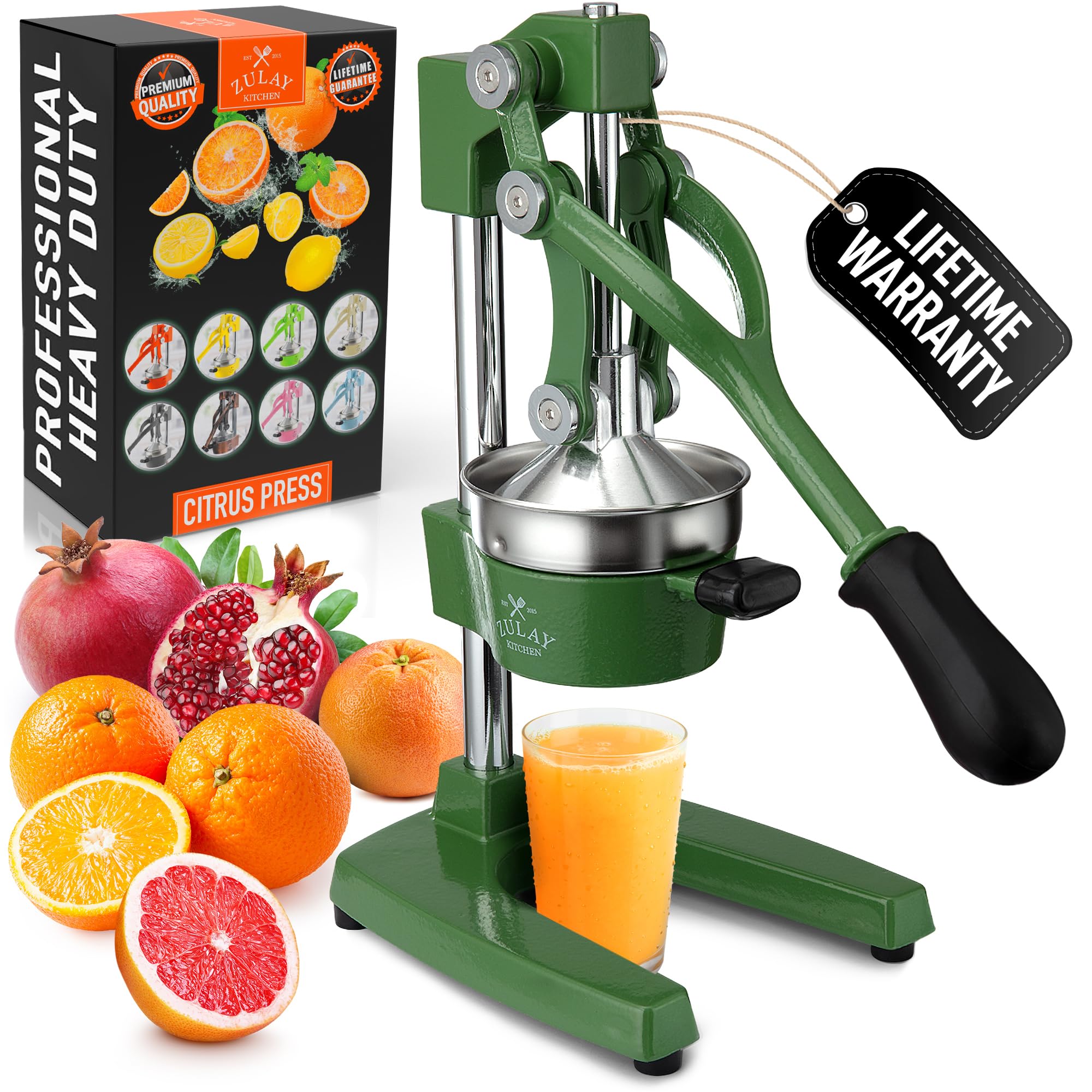 The Zulay Kitchen Cast Iron Juicer is the last manual juice press you will ever need. Built from heavy duty cast iron, this orange juicer and citrus presser is engineered for both commercial and home use — whether you are a bartender, juice bar owner, or health enthusiast squeezing fresh citrus daily. The mechanical hand press juicer delivers serious leverage, extracting maximum juice from oranges, lemons, limes, grapefruit, and pomegranates with a single press. The stainless steel strainer bowls catch seeds and minimize pulp, giving you clean fresh squeezed juice every time. Unlike electric juicer machines, this manual citrus press requires no electricity, no batteries, and no complicated setup — just pure fresh juice on demand. The rubberized feet keep the metal juicer firmly planted on any counter, while the cast iron construction handles continuous high pressure use without wearing down. The 5 inch diameter bowl accommodates a wide range of citrus fruit sizes, from small limes to large grapefruits, making it the most versatile manual juicer hand press for any kitchen or bar setup. Cleanup is simple — remove the two stainless steel strainer pieces and rinse, then wipe down the pressing mechanism. This industrial grade cast iron juice press is perfect for high volume commercial use, lemonade stands, bar service, and professional citrus juicing. Available in 20+ colors to match any kitchen or bar aesthetic, this cast iron juicer also makes the perfect gift for bartenders, foodies, and health enthusiasts. Exprimidor de naranjas y limon de hierro fundido para uso profesional y domestico. Whether you need a lemon squeezer, lime juicer, grapefruit juicer, or orange squeezer, this non electric hand crank juicer and commercial juice press handles it all. A must have kitchen gadget for lemonade stands, bar juicer setups, and fresh juice lovers everywhere. Exprimidor de limones, naranjas y toronjas — esprimidoras de jugo de naranja para uso comercial y domestico.