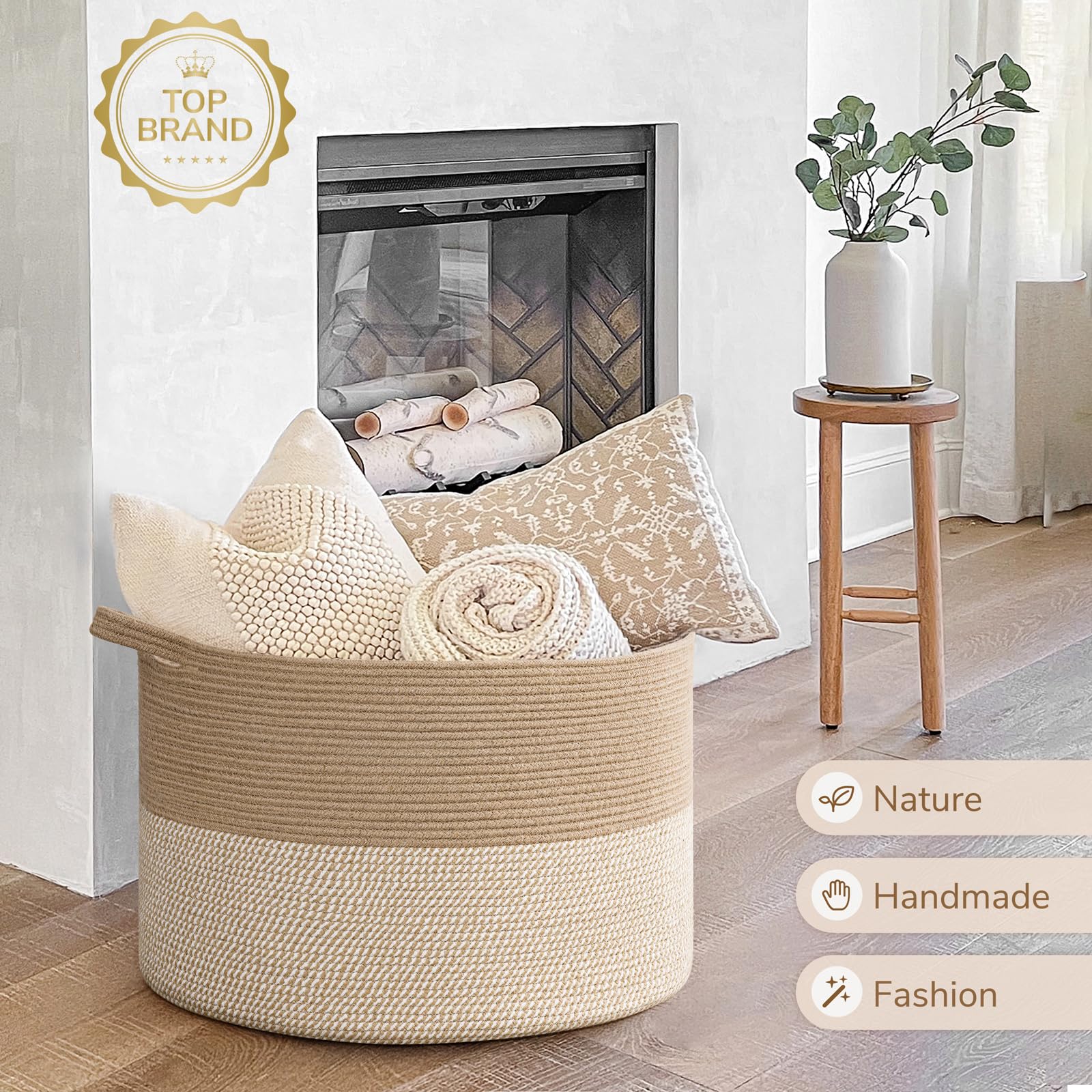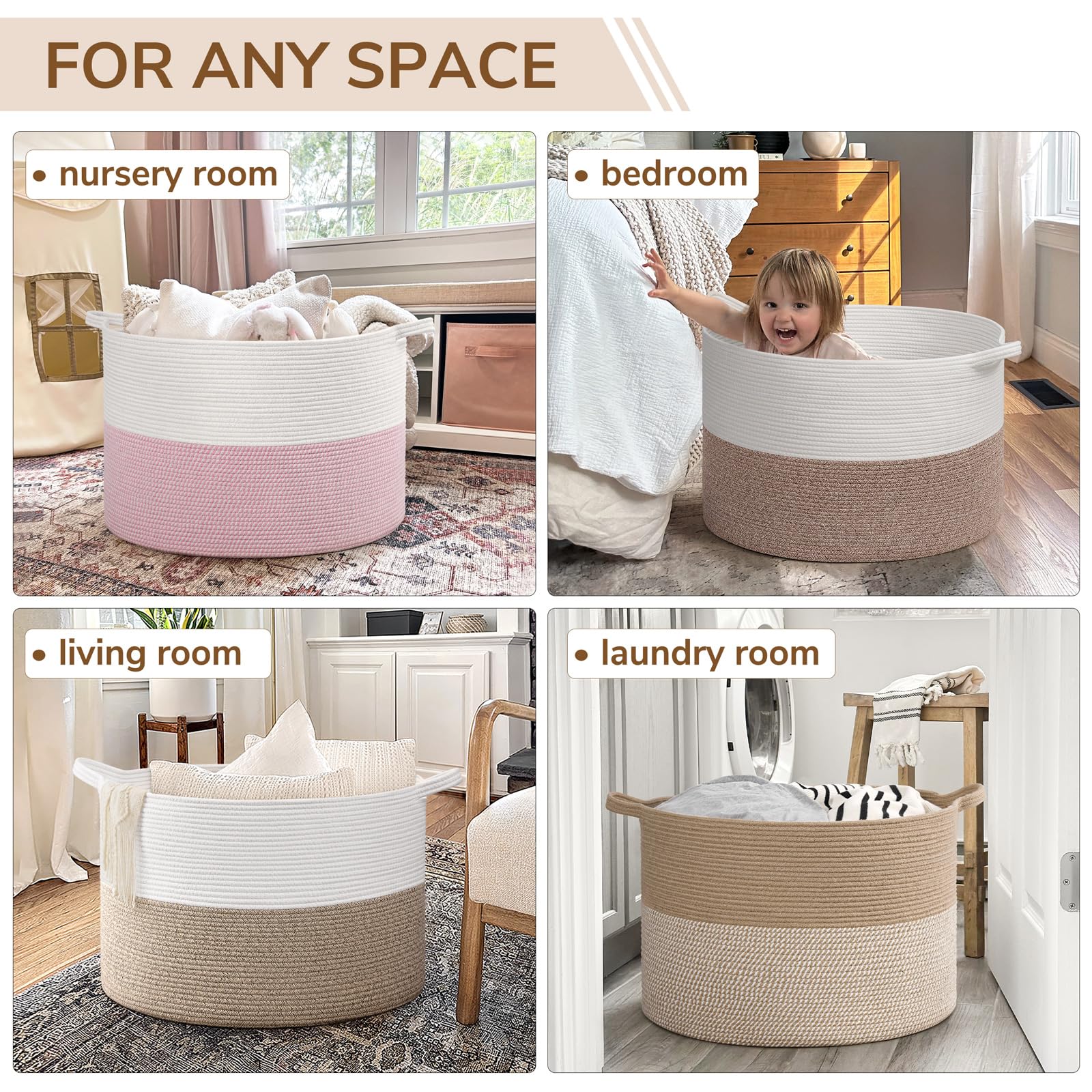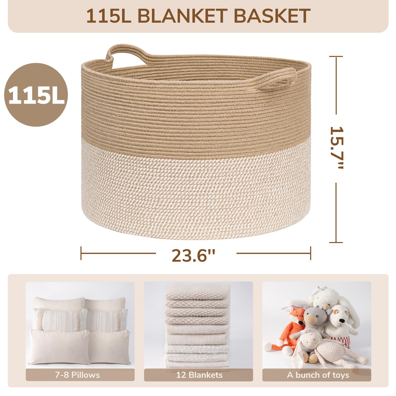 Spacious Jumbo Design. This 115L large wicker basket(23.6"D x 15.7"H) provides 30% more space than our 90L model, perfect for larger families or more extensive organizing needs. It easily holds extra blankets, clothes, and toys, keeping your home tidy and stylish.