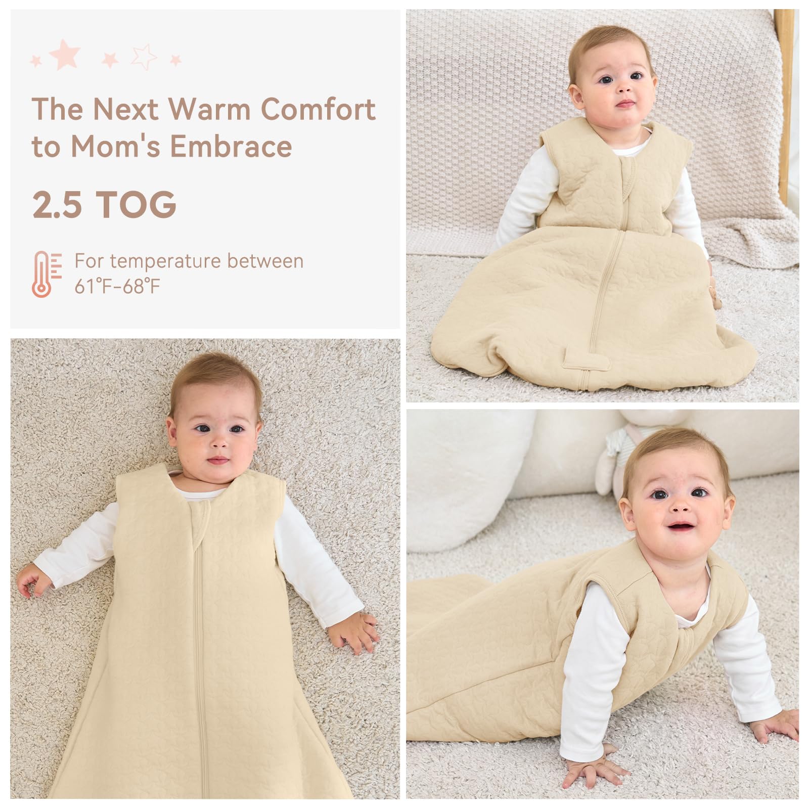 Warm 2.5 Tog: Made of 100% cotton fabric and fluffy polyester filling, our winter sleep sack is super soft and skin-friendly to baby's delicate skin. 2.5 TOG sleep sacks are suitable for cold winter and room temperatures from 61℉ - 68℉, keeping your little one warm and comfortable.