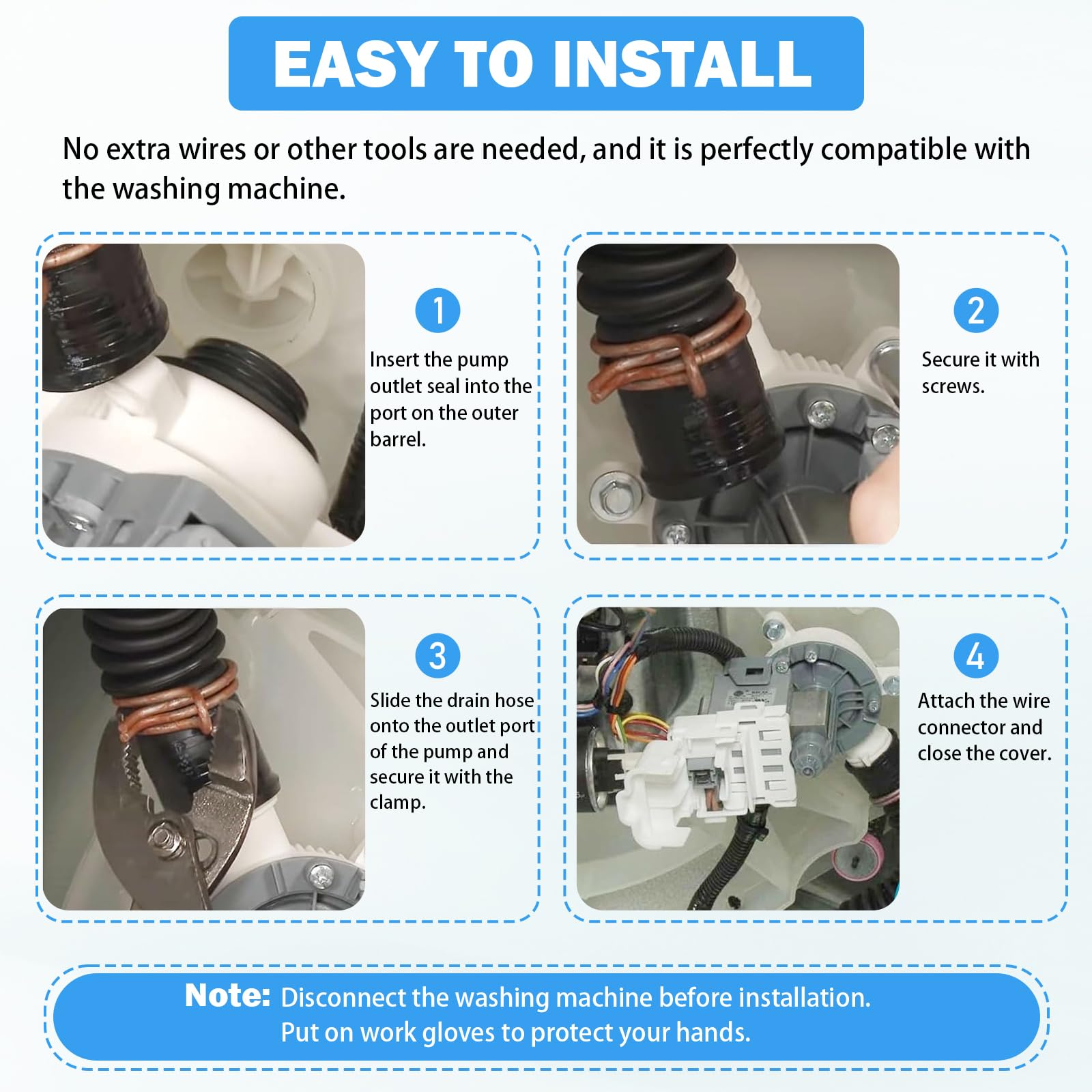 PREMIUM QUALITY - Whirlpool washer drain pump is made of high quality material, heat and wear resistance, more durable. It is very easy to install, no extra wires or other tools are needed, and it is perfectly compatible with the washing machine. If your washer does not drain and water still remains in the tub, you may need this TOVEN-RV maytag top load washer drain pump. Unplug the gasket before installing this replacement part. It's suggested to wear gloves to protect your hands.