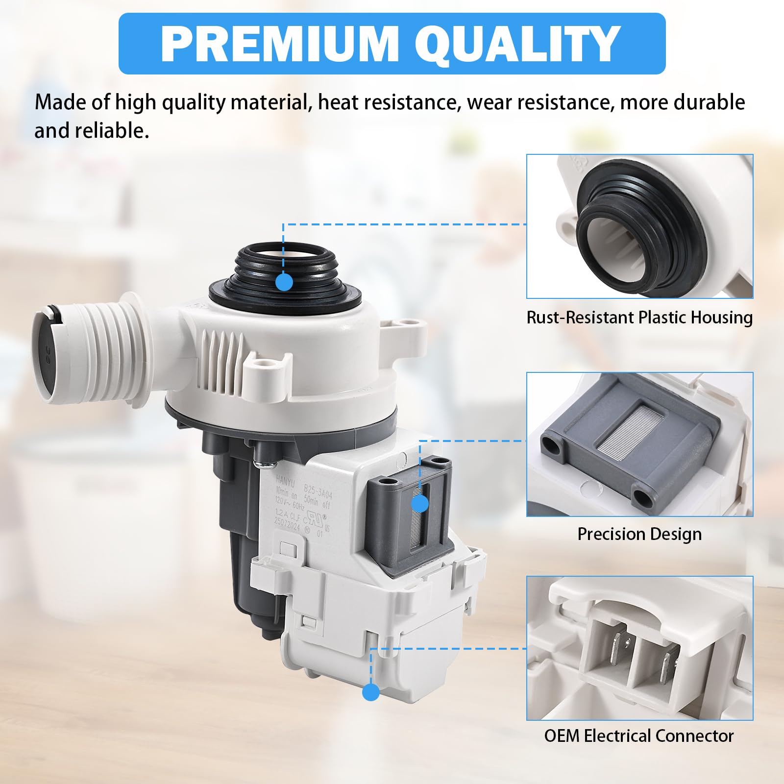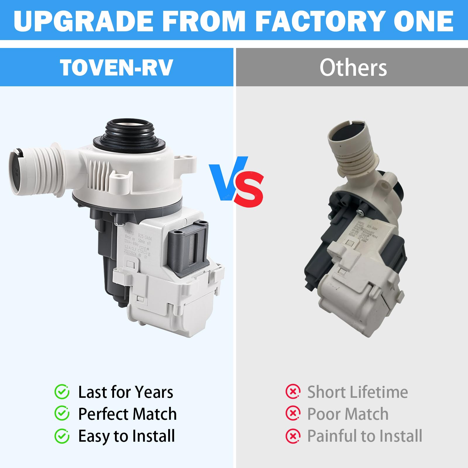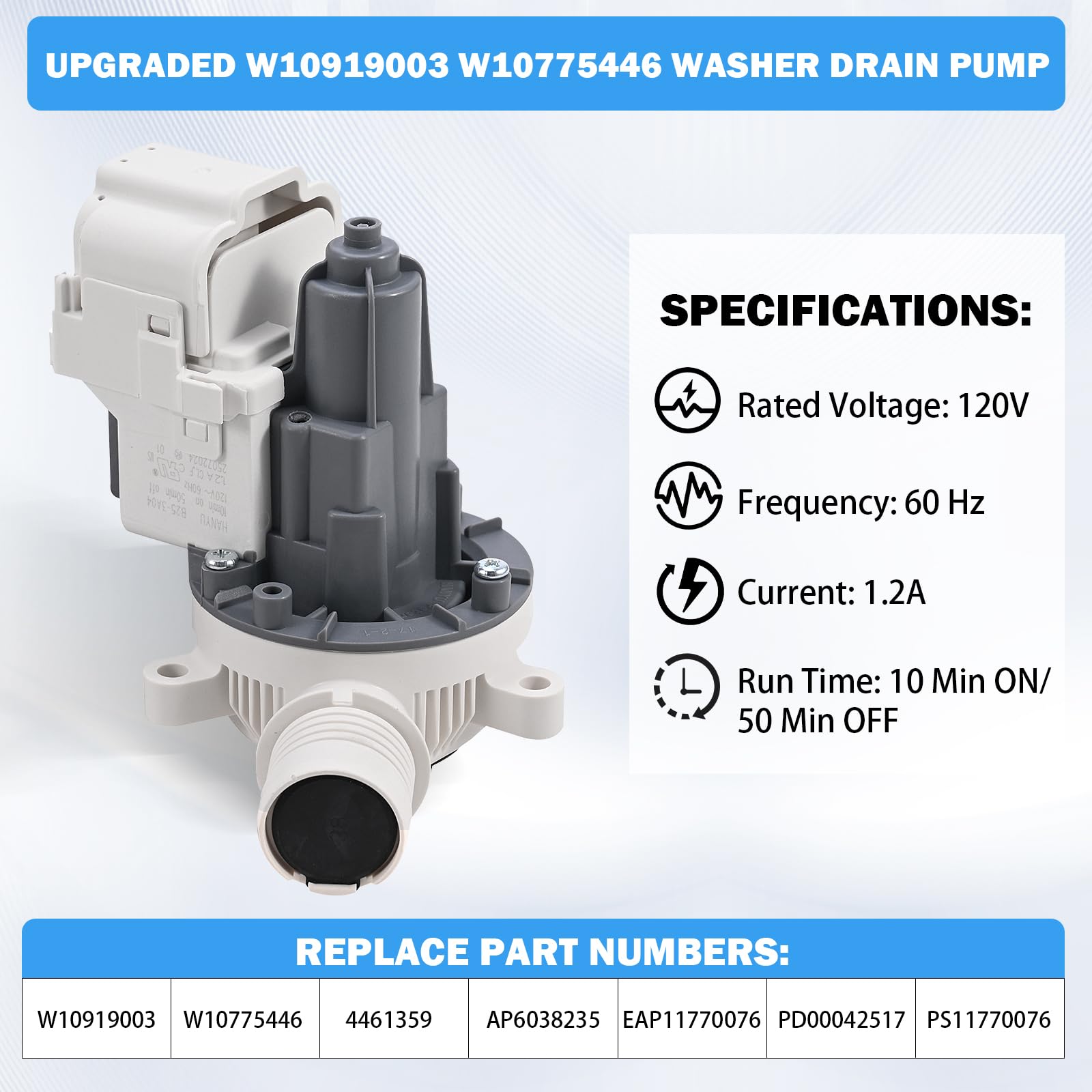 UPGRADED WASHER DRAIN PUMP ASSEMBLY - W10919003 washer drain pump is designed to remove the water from the washer during the drain portion of the cycle. Order and replace a new whirlpool drain pump assembly from TOVEN-RV, help you to fix the common problems of your washer such as "Cycle is noisy; Washing machine is not draining; Washer Leaking; Not cleaning properly; Washer pumps but not spin, etc,.