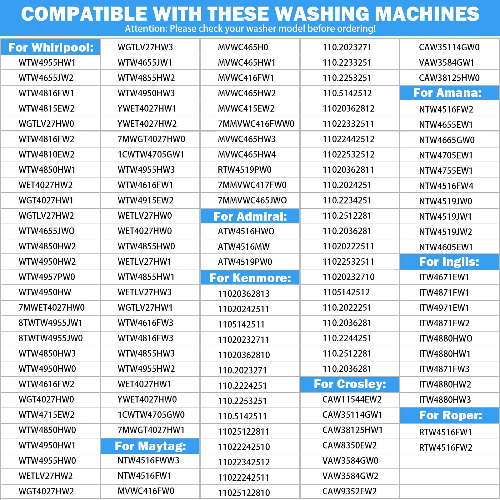 FIT THESE WASHER MODELS - Compatible with Amana, Crosley, Inglis, Kenmore, Maytag, Roper, and Whirlpool top load washer models including Models 110, 7MW, MVW, WET, WTW, etc,. Compatible with WTW4616FW1, WTW4616FW2, WTW4655JW0, WTW4655JW1, WTW4715EW2, WTW4810EW2, WTW4815EW2, WTW4816FW1, WTW4816FW2, WTW4850HW0, WTW4850HW1, WTW4850HW2, WTW4855HW0, WTW4855HW1, WTW4855HW2, WTW4915EW2, WTW4950HW0, WTW4950HW1, WTW4950HW2, etc,. Other applicable models please refer to the product description. Thanks!