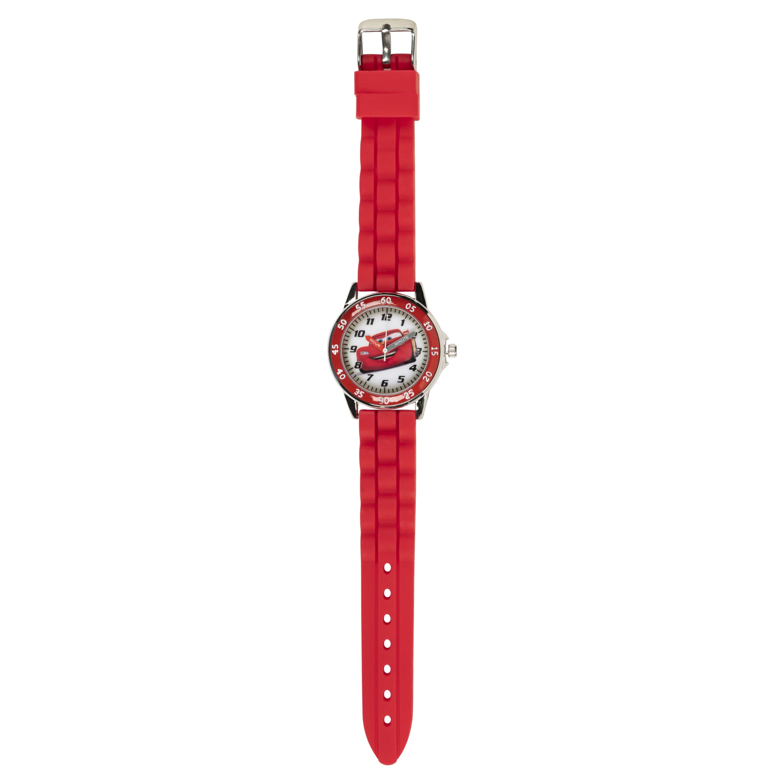 Description Product Description Rev up your child's time-telling skills with the Disney Pixar Cars Kids' Time-Teaching Watch. Featuring Lightning McQueen in a bold and colorful design, this watch is perfect for young fans of the beloved Cars franchise. Designed with time-teaching hour and minute hands, it helps children learn how to read the time in a fun and engaging way. The durable red silicone strap provides a comfortable fit for everyday wear, while the adjustable sizing accommodates wrists from 5.5" to 8". The easy-to-read dial includes large numbers and minute markers, making it a practical tool for learning and fun. Packaged in a collectible Cars-themed tin, this watch is the ultimate gift for birthdays, holidays, or any special occasion for Lightning McQueen fans. From the Manufacturer This is a Disney Cars time teacher watch, suitable for young children learning how to tell Tim