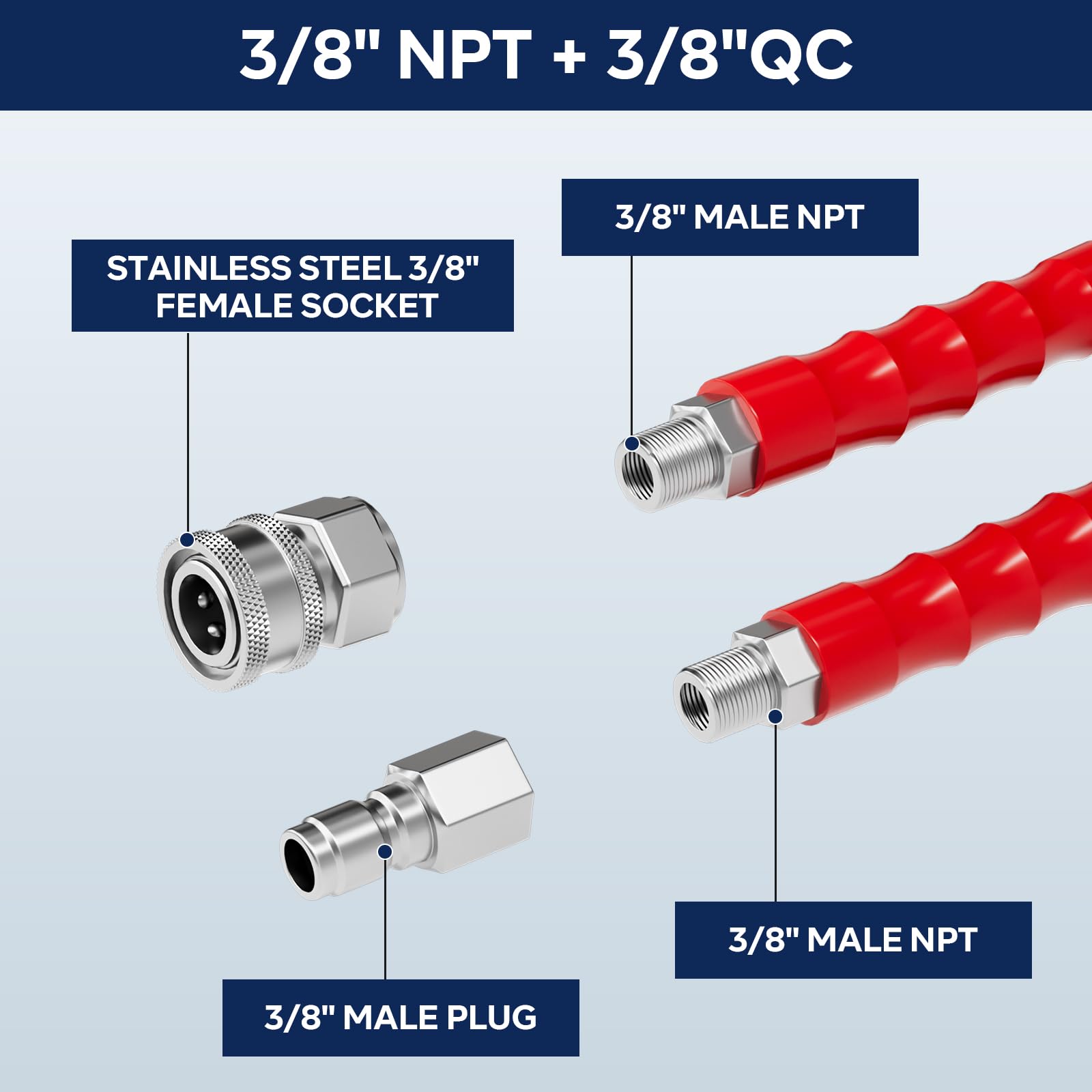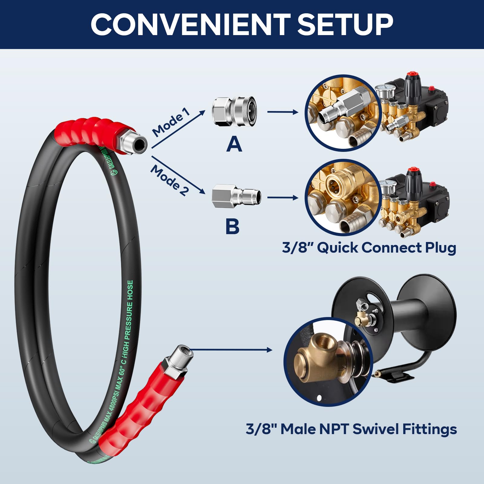 3/8" Quick Connect: Pressure washer hose has quick connectors on both ends to save your time. 3/8” quick connect plug and 3/8” quick disconnect fit most pressure washer and pressure washer hose reel. The quick coupler can also be removed, leaving the threaded end for the hose reel.