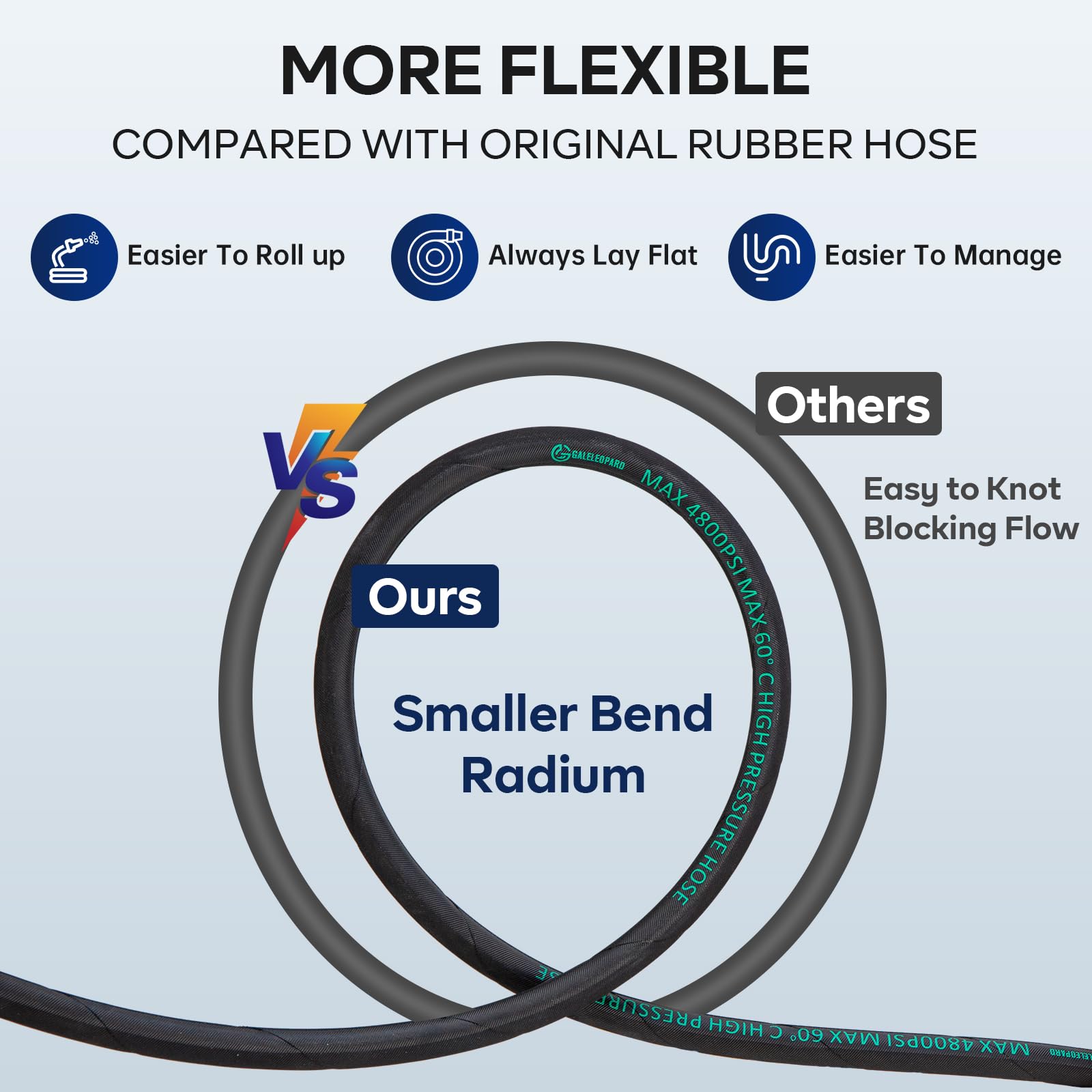 Durable: The pressure washer whip hose is made of upgraded high tensile steel-wire braid, more durable. Pressure washer hose whip is non marking and never kink permanently. Easy to carry, drag and roll up.