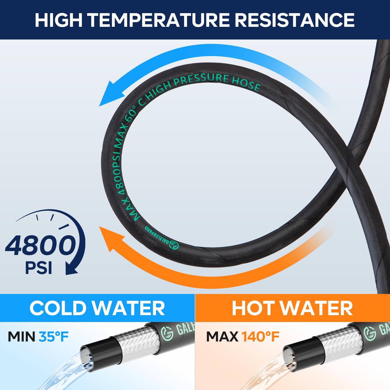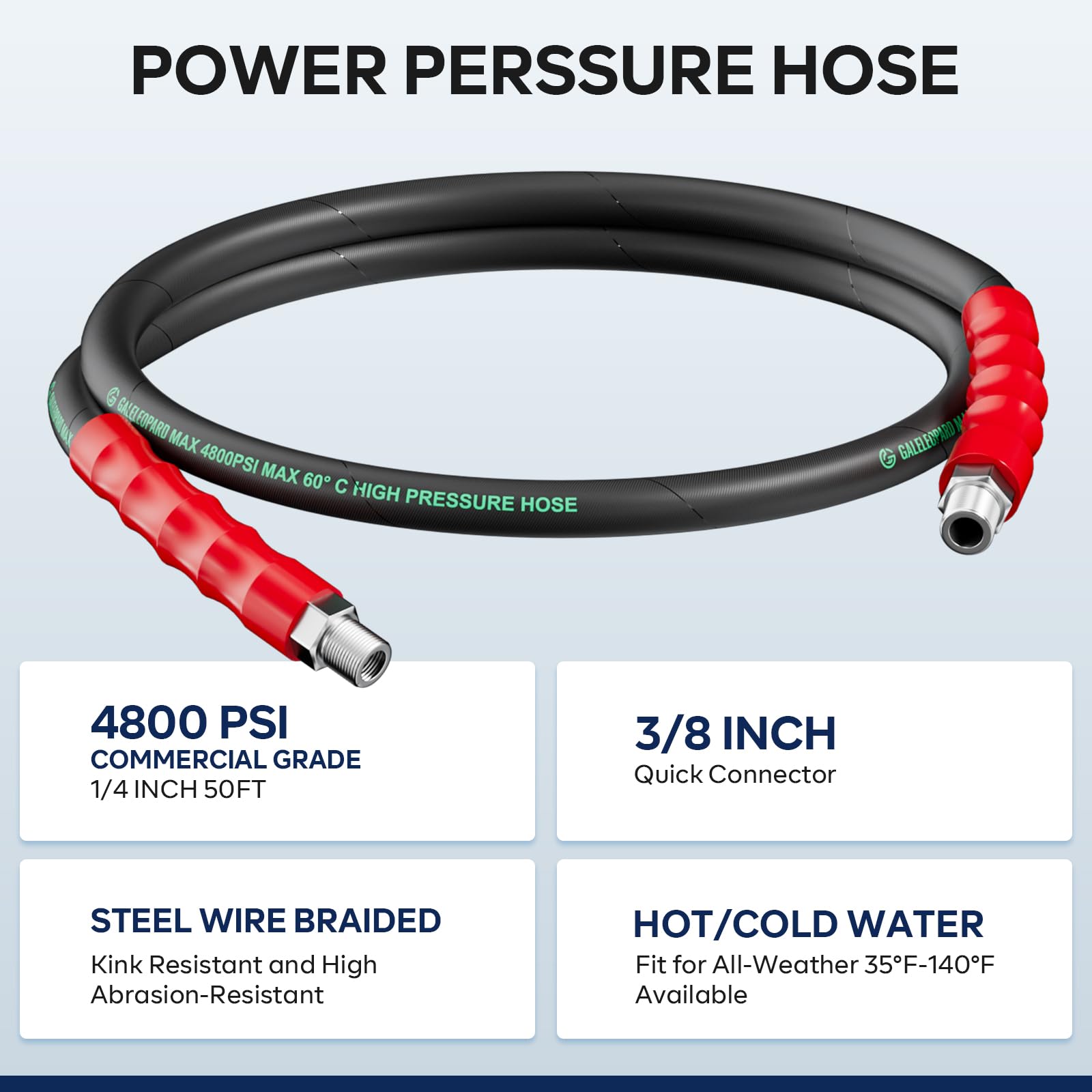 10FT Pressure Washer Whip Hose: Max Working Pressure is up to 4800 PSI. Burst Pressure is up to 16000 PSI. Flow rate is from 2.5 GPM to 5 GPM. Max working temperature is 140℉ / 60℃.
