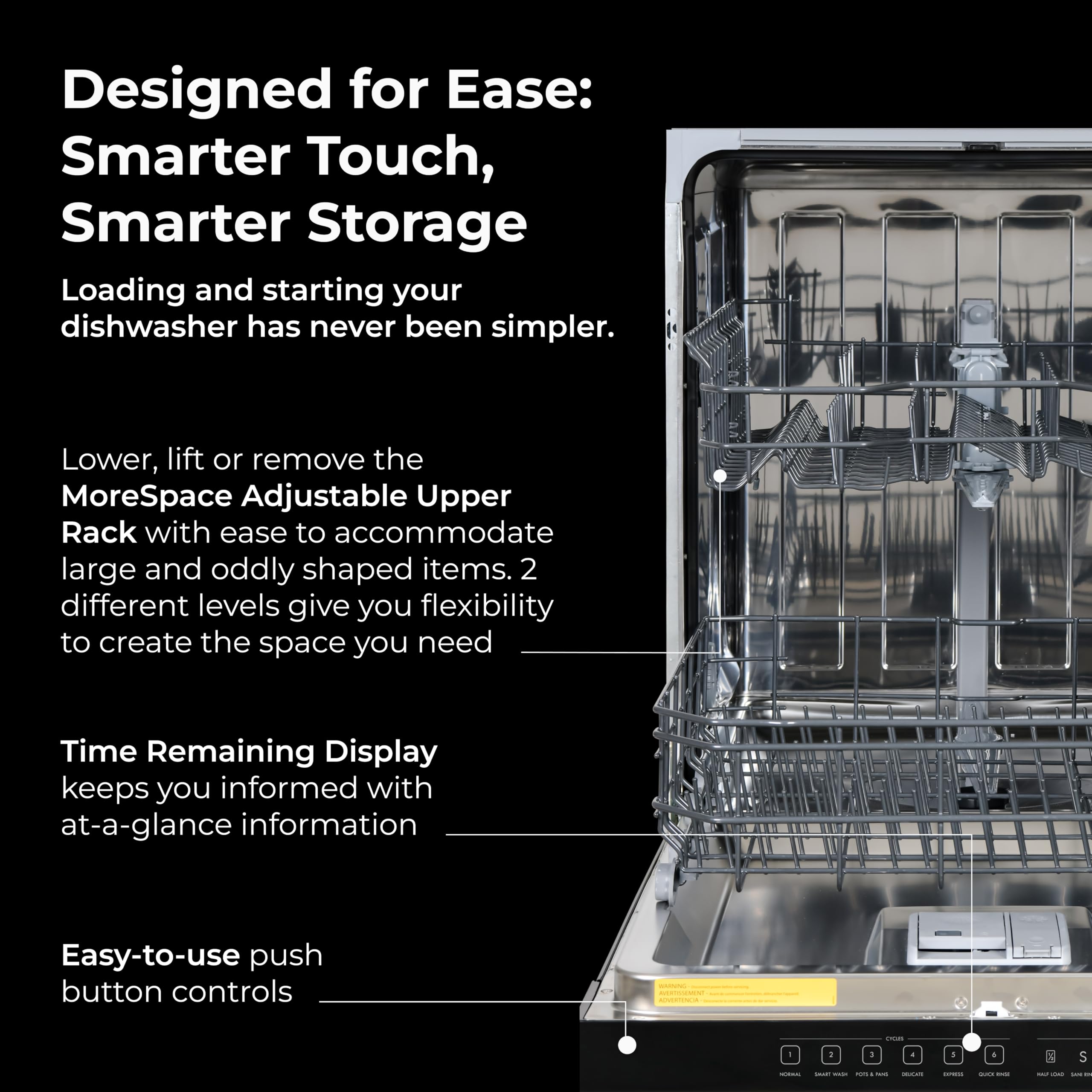 Roomy Interior & Adjustable, Removable Rack: Fit up to 14 place settings or just a few items using the Half Load option. The MoreSpace Adjustable Upper Rack raises, lowers, or removes entirely to make room for pots, tall items, or delicate stemware