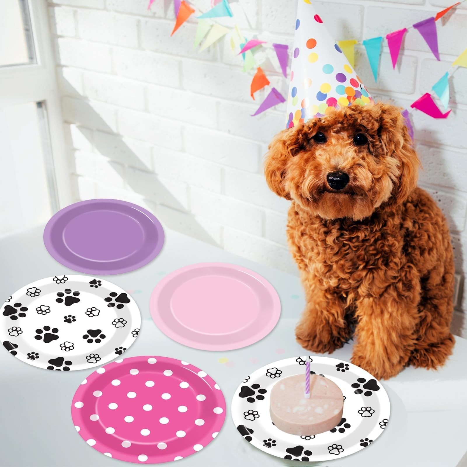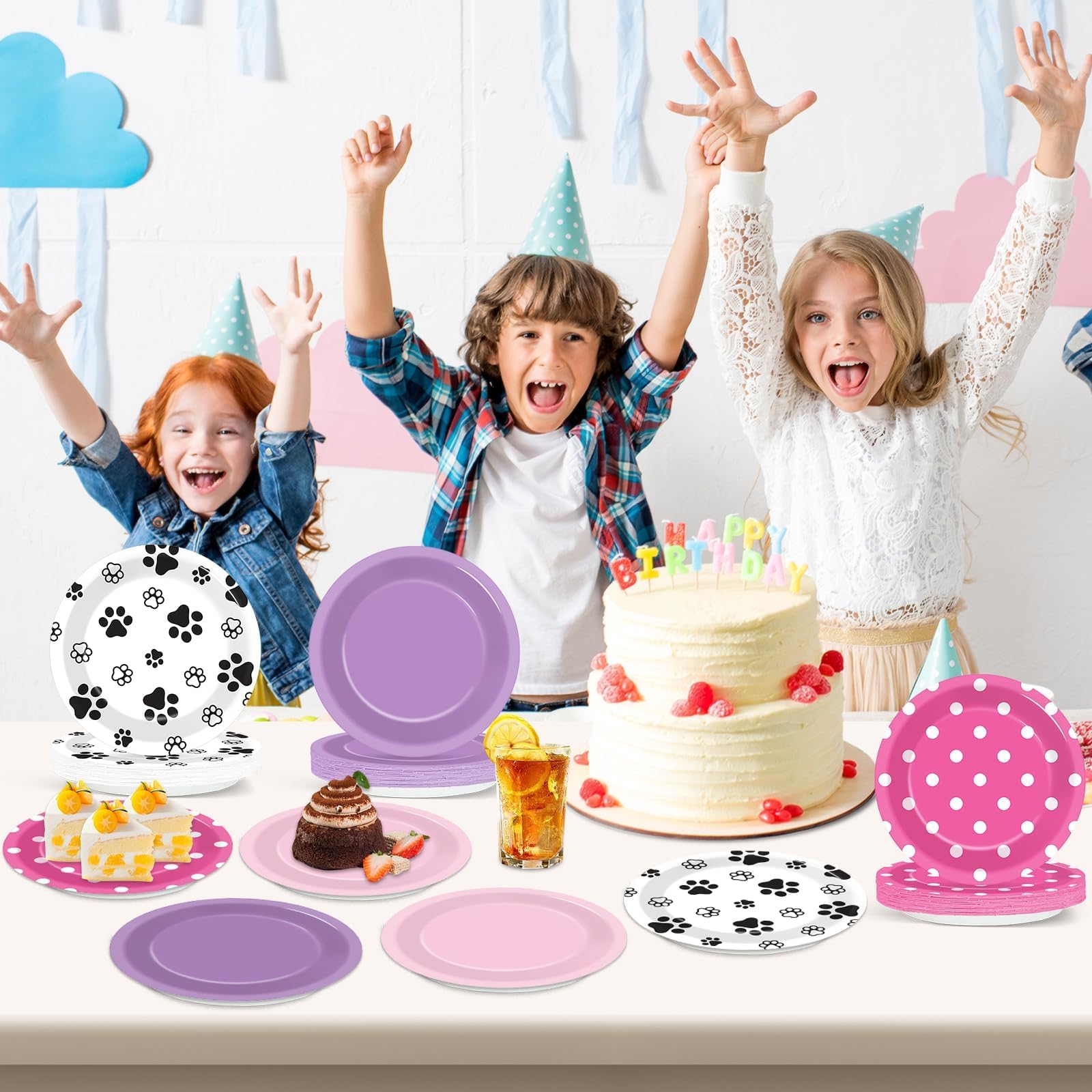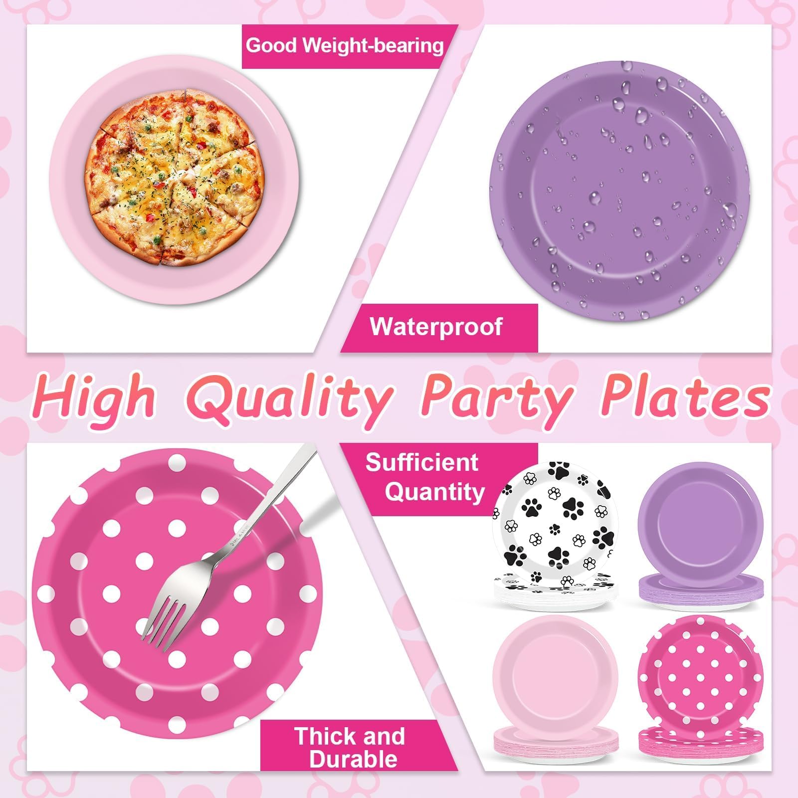 Exquisite design: Add a pop of color to your celebration with our paw party plates. These puppy birthday party decorations feature an adorable paw print design in 4 different designs like black paw, pink polka dots, purple and light pink pure color. This puppy birthday tableware set is ideal for any puppy birthday or dog themed birthday party.