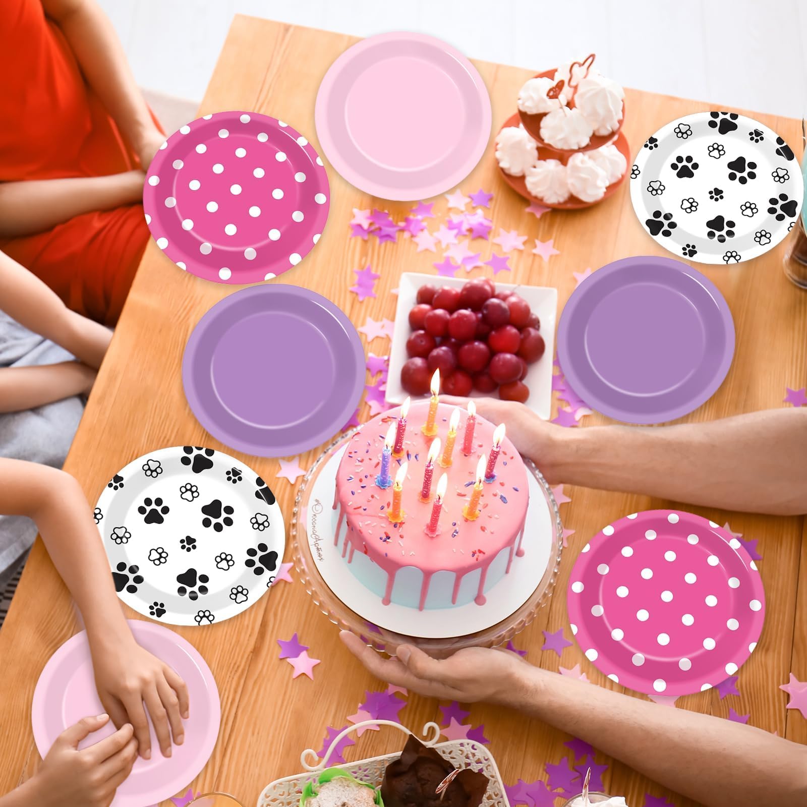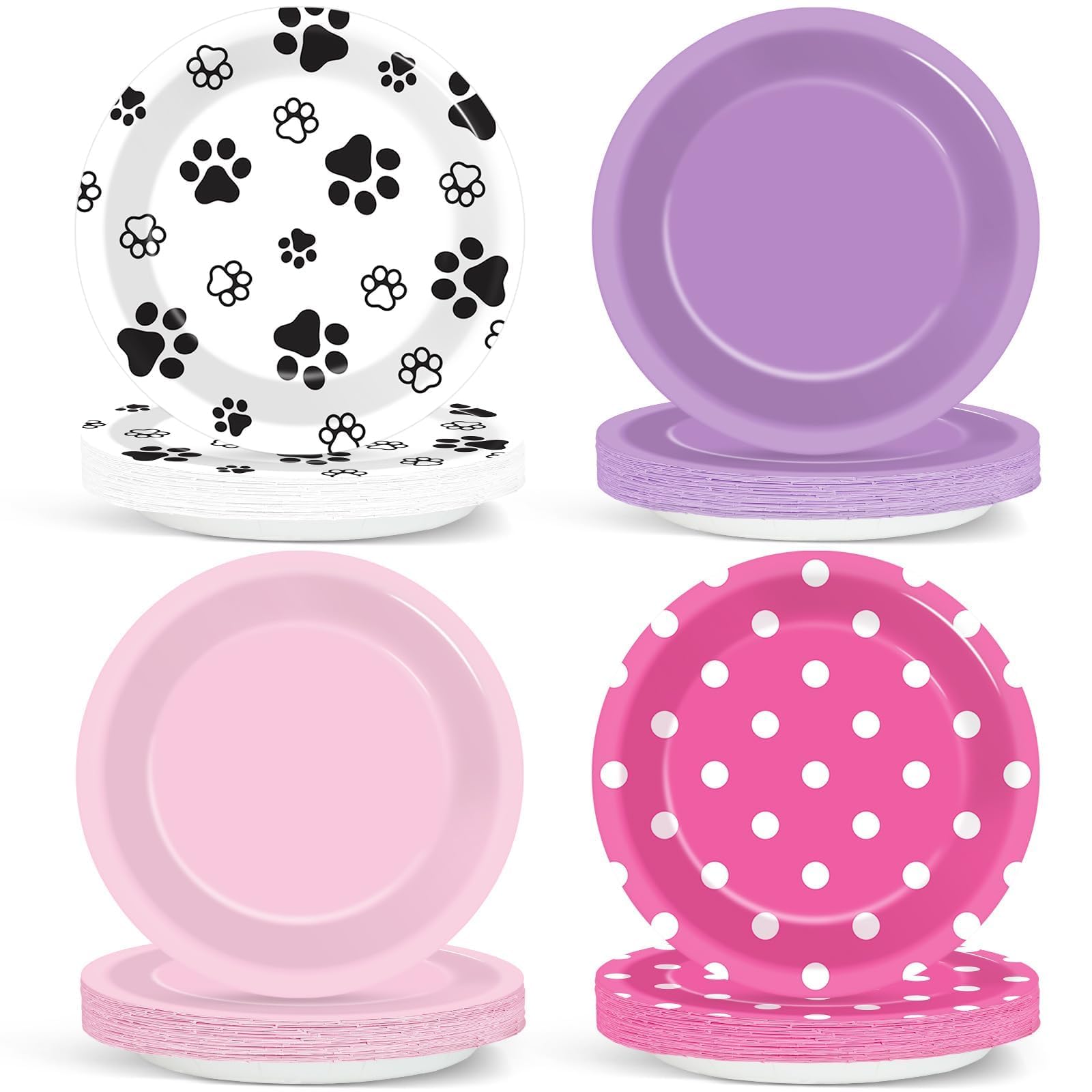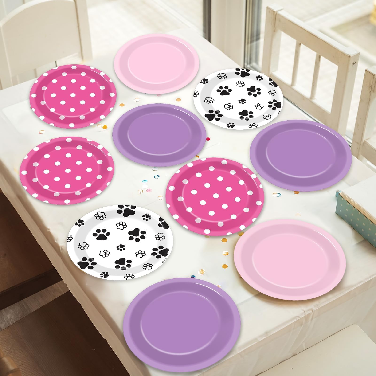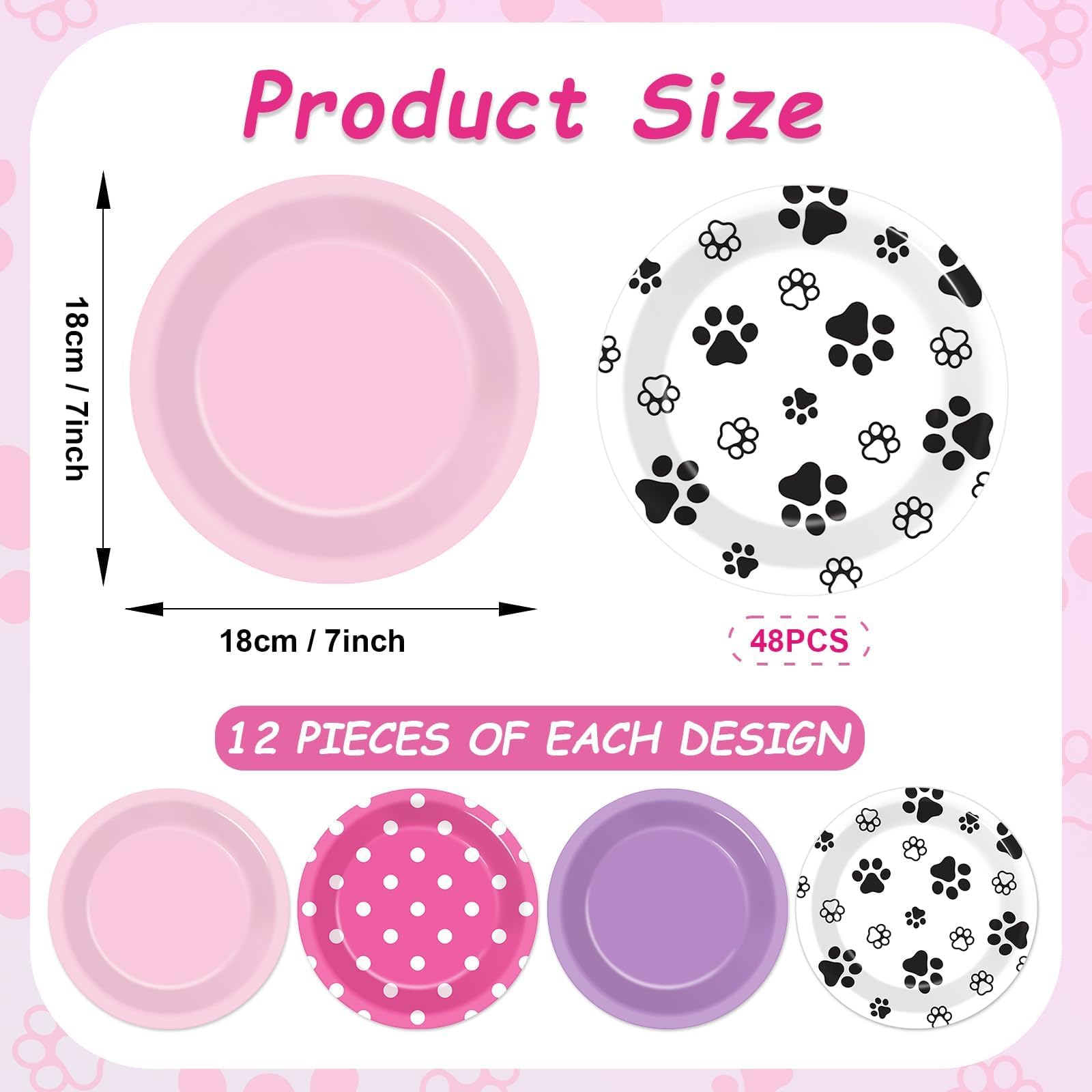 Exquisite design: Add a pop of color to your celebration with our paw party plates. These puppy birthday party decorations feature an adorable paw print design in 4 different designs like black paw, pink polka dots, purple and light pink pure color. This puppy birthday tableware set is ideal for any puppy birthday or dog themed birthday party.