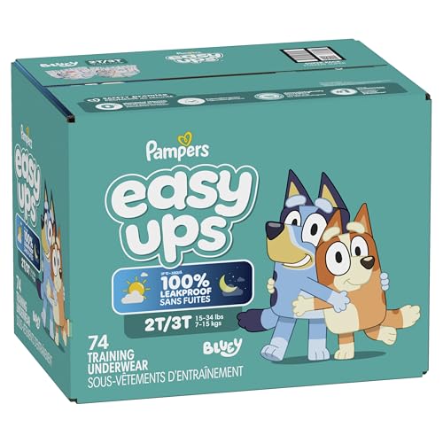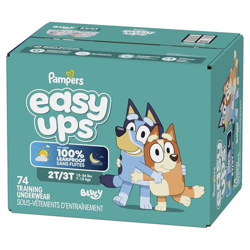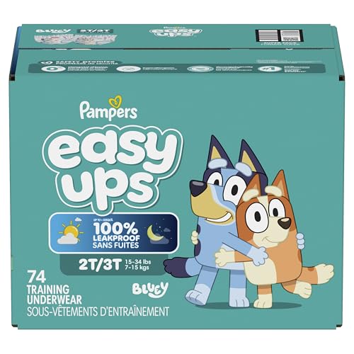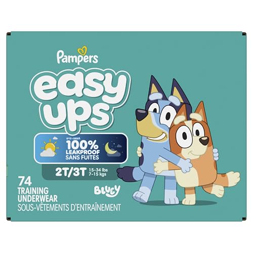 Ready to potty train with bluey? Pampers Easy Ups Training Pants featuring bluey makes it easy. They pair the feeling of real under wear with the protection of Pampers to make potty training easier for everyone. Give your child the confidence to take on potty training with a little more independence and a lot more fun. Easy Ups Training Pants feature stretchy sides and an underwear-like waistband for easy pull up and down, plus an ultra-absorbent core with LockAway Channel to help keep them dry day and night. With up to 2X better protection day and night*, Easy Ups training pants deliver up to 100% leakproof protection. These hypoallergenic, dermatologist-approved pull ups are made with 0% elemental chlorine, parabens, or latex** and backed by the Pampers Safety Promise. Fun Bluey designs motivate your toddler to potty train. Pampers Easy Ups training pants are also available with Peppa Pig! Pair with Pampers Sensitive Wipes to help keep your toddler's skin healthy. Find your toddler’s best fit in the following sizes: training pants 2T–3T (diaper size 4,15–34 lbs.), training pants 3T–4T (diaper size 5, 20–40 lbs.), training pants 4T–5T (diaper size 6, 23-50 lbs.), training pants 5T–6T (diaper size 7, 35–60 lbs.), training pants 6T–7T (diaper size 8, 46+ lbs.) *Urine leaks vs. leading competitor size 2T-3T ** No natural rubber †Pricing based on MSRP; excludes Easy Ups Jumbo. Pricing at the sole discretion of the retailer