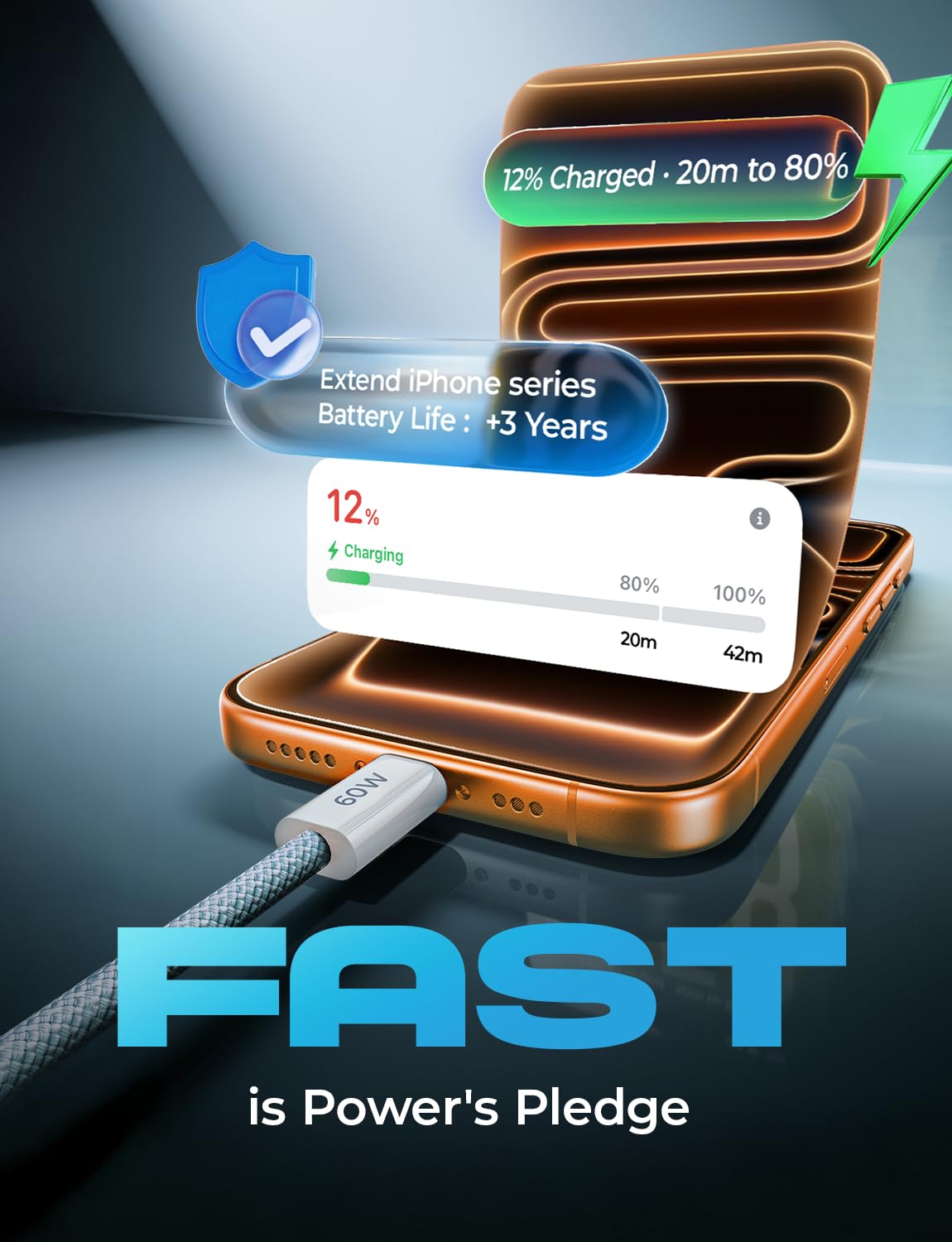 【60W Turbo Fast Charging】This iPhone 17 charger cord support PD3.0/QC3.0/QC4.0 fast charging up to 60W Max (20V/3A) with USB-C Power Delivery adapters such as 30W/45W/60W. Which 2.2X faster than 3.1A version and charges USB C Phone from 0% to 80% within 35 minutes, iPad Pro 64% within 35 minutes, Macbook air 50% within 35 minutes, and data transfer speeds up to 480Mbps (1200 songs synced per minute) compatible with Samsung,Tablt,iPad Air Mini Pro,Macbook and More.