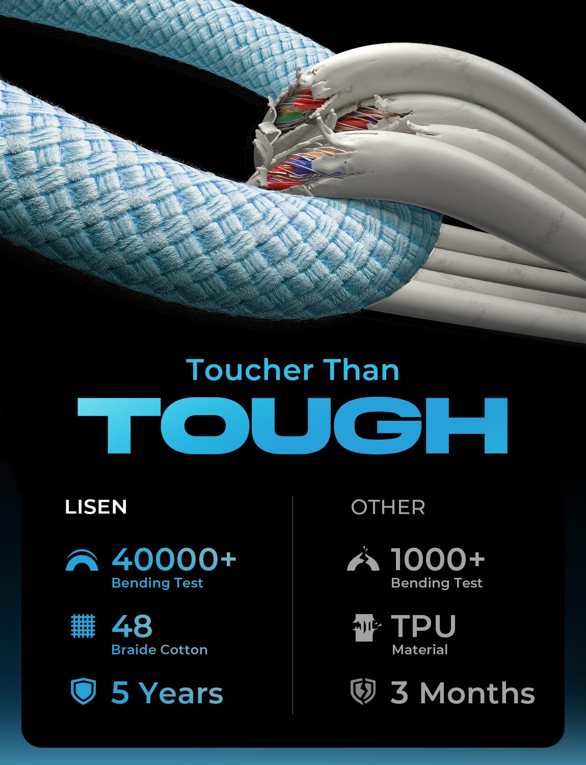 【Green Recyclable Materials】The LISEN USB C to USB C iPhone 17 16 15 charger fast charging you rely on most are braided from 48 strands of recyclable cotton yarn material. This braiding design also helps to prevent tangling and damage from bending and twisting. Using recycled materials is one of the ways we can lower the carbon impact of our products, since these materials often have a lower carbon footprint than materials from primary sources.