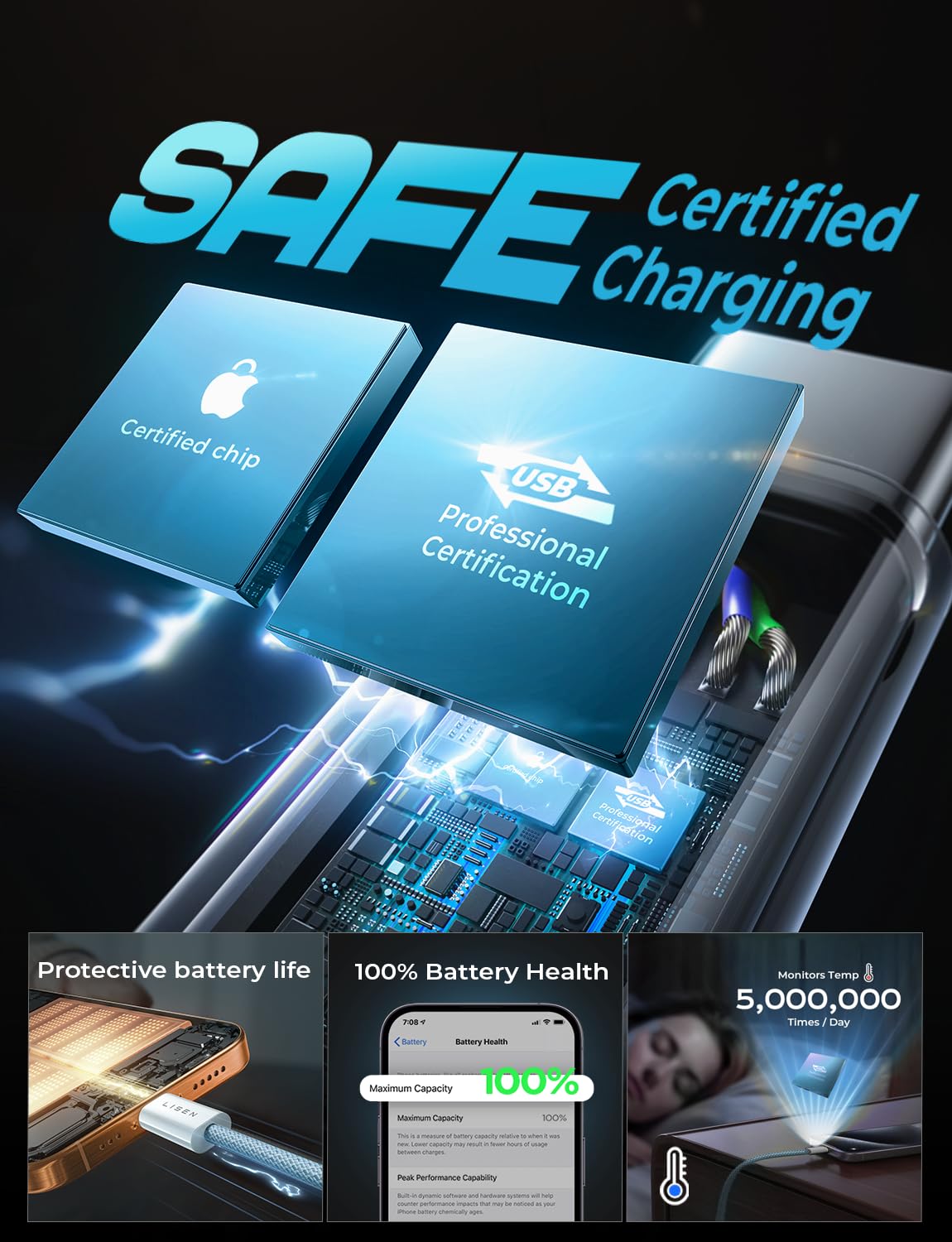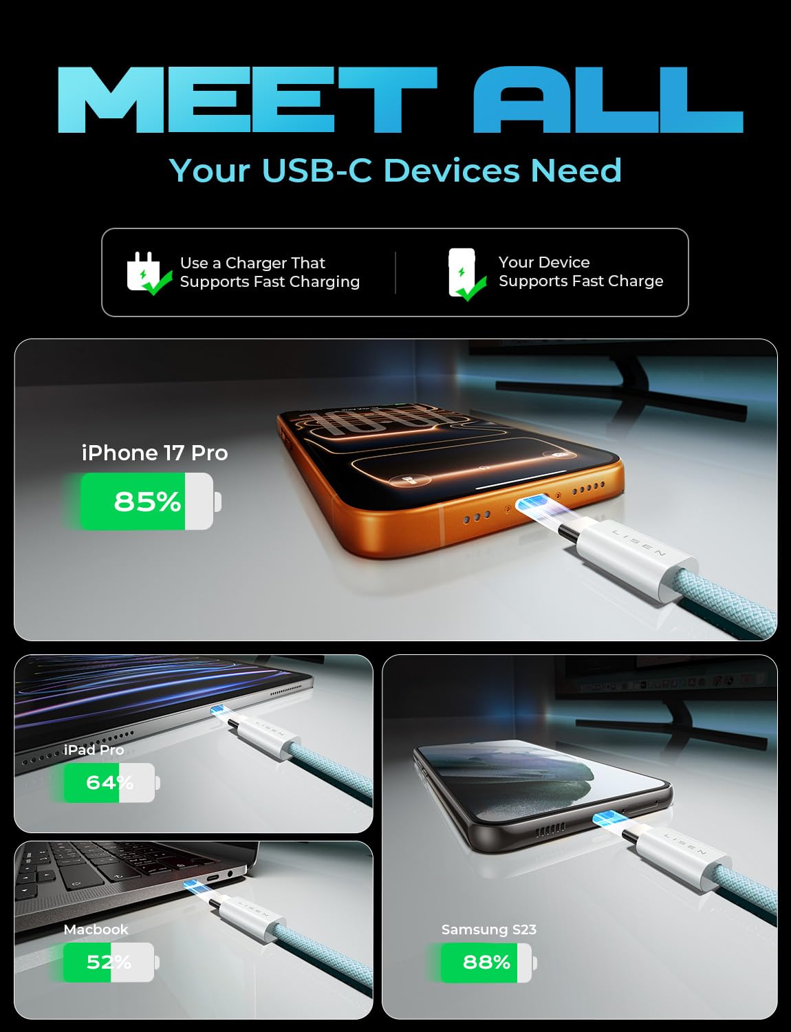 【Right for ALL Your Devices】This is the USB-C to USB-C cable Not the USB-C to USB-A cable, iPhone 17 Pro Max fast charger Compatible with virtually all USB-C devices including phones, tablets, and laptops. Such as Samsung Galaxy S25/S24/S23/S22/S21+/S21/S20/ S20+/ S20 Ultra/ Note 10, MacBook Air/Pro 13'', iPad Mini 6, iPad Pro 2021/2020/2018, iPad Air 2020 and more.This product supports bulk purchasing, making it ideal for businesses and large orders.