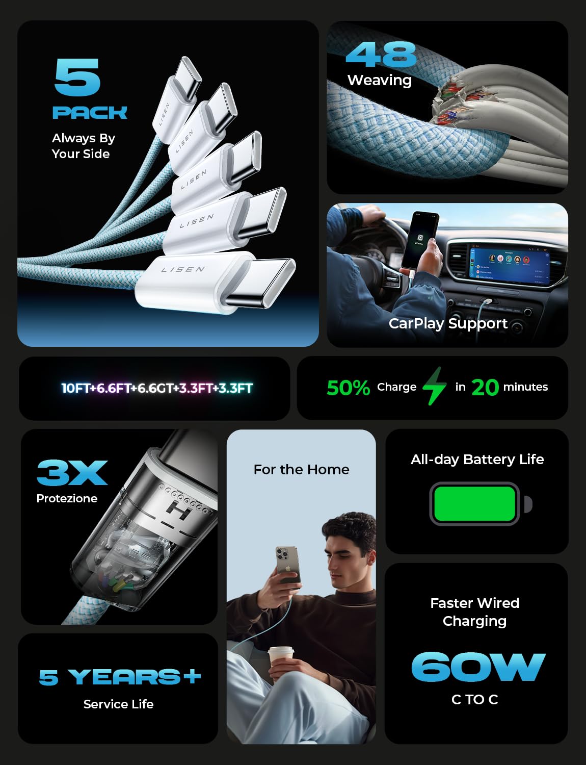 【What You Get】LISEN USB C to USB C Cable 5-Pack (3.3/3.3/6.6/6.6/10FT), 24-Month worry-free period and 24/7 customer service, if you have any questions, we will resolve your issue within 24 hours. Whether you're shopping for samsung or iphone 16 pro max charger cord accessories gifts for men/women or reliable car accessories, this super fast charger usb c to c cable is built to last