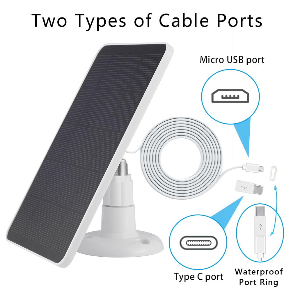 Micro USB & USB-C Ports: The solar panel is mainly used for outdoor battery powered security cameras with universal Micro USB or USB-C ports, NOT compatible with plug-in cameras