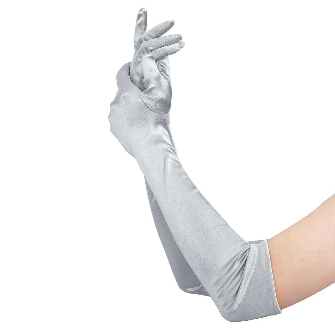 Description Women's White Long Satin Gloves Bridal Dance Gloves For Special Occasion Evening Party, Black, White, Pink, Red Material: Made of 90% Nylon + 10% Spandex, stretchy and easy to put on. Stretch ,soft, smooth, sleek, comfortable to wear The best to hand wash and air dry. Package include: 1 Pair Gloves.