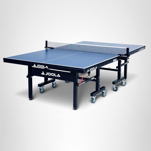 JOOLA Inside 25mm Table Tennis Table is the ideal choice for both casual play and serious competition. This high-quality indoor table boasts a 1-inch (25mm) MDF multi-layer surface that provides the consistent bounce needed for competitive play. Enjoy a hassle-free setup, as the table arrives 95% pre-assembled—just attach the legs using only 8 bolts and secure the tournament-grade screw clamp net in minutes. The innovative two-halves design allows for versatile play, enabling you to use one half for solo playback mode while keeping the other half vertical. When not in use, the table's separate 4-wheel trolley systems and locking caster wheels make it easy to move and store compactly. The sturdy undercarriage features foldable steel legs with adjustable rubber feet for a level playing surface and a safety latch system that locks the table securely in both positions. The tournament-quality dark blue tabletop with silk-screened white striping is UV-cured to create a durable and smooth playing area. Perfect for any game room, the JOOLA Inside offers the performance, safety, and convenience that players need to take their game to the next level.