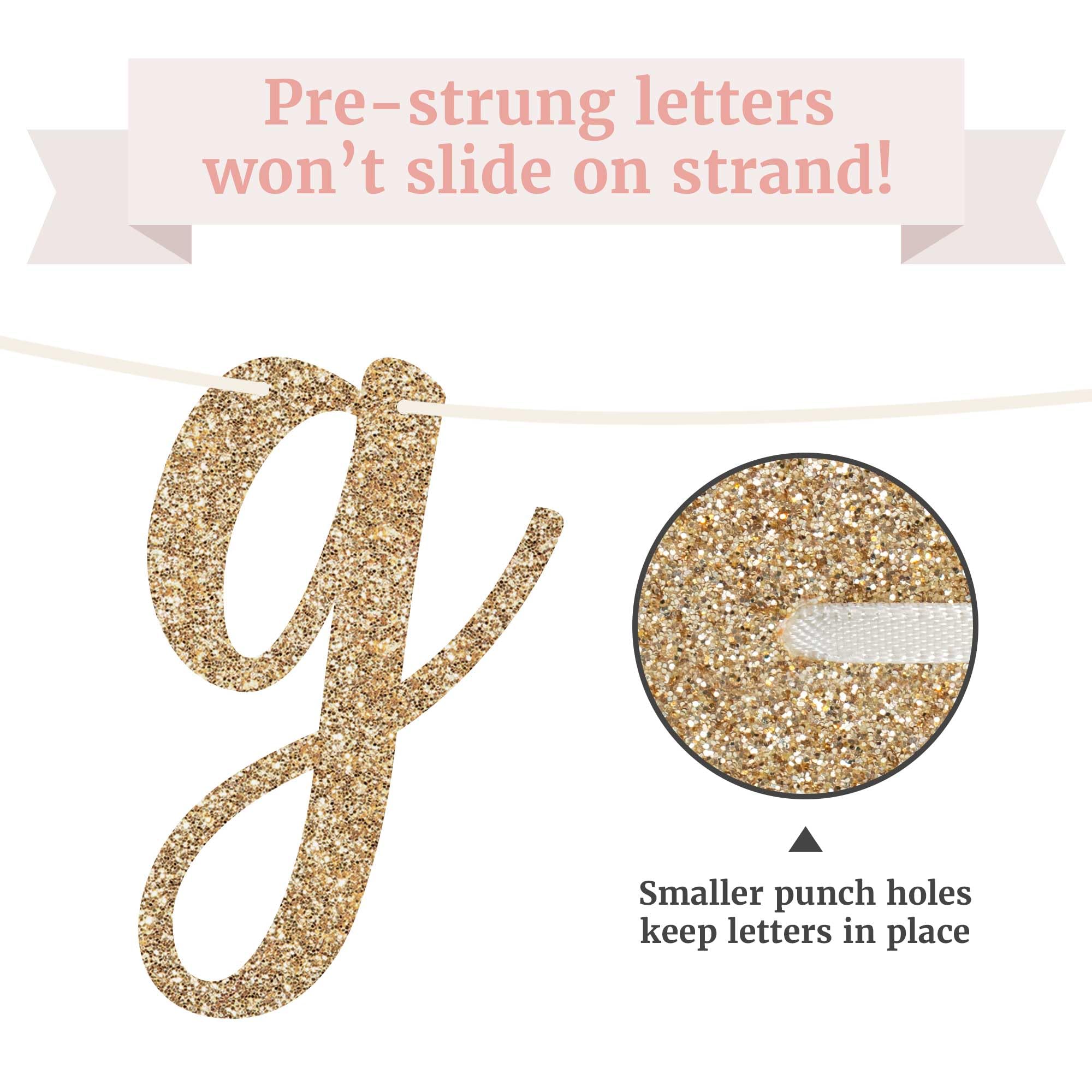 ☑️ THICK, HIGH QUALITY CARDSTOCK MADE TO LAST - Each letter pendant is made from strong 350 gsm/130lb cardstock, so that you can store for future use or pass it on to a friend for their event! The real gold glitter adds the perfect touch to your decorations. You can easily add them to mantels, banisters, windows, dessert tables, or even use as a photo backdrop. The options are endless!