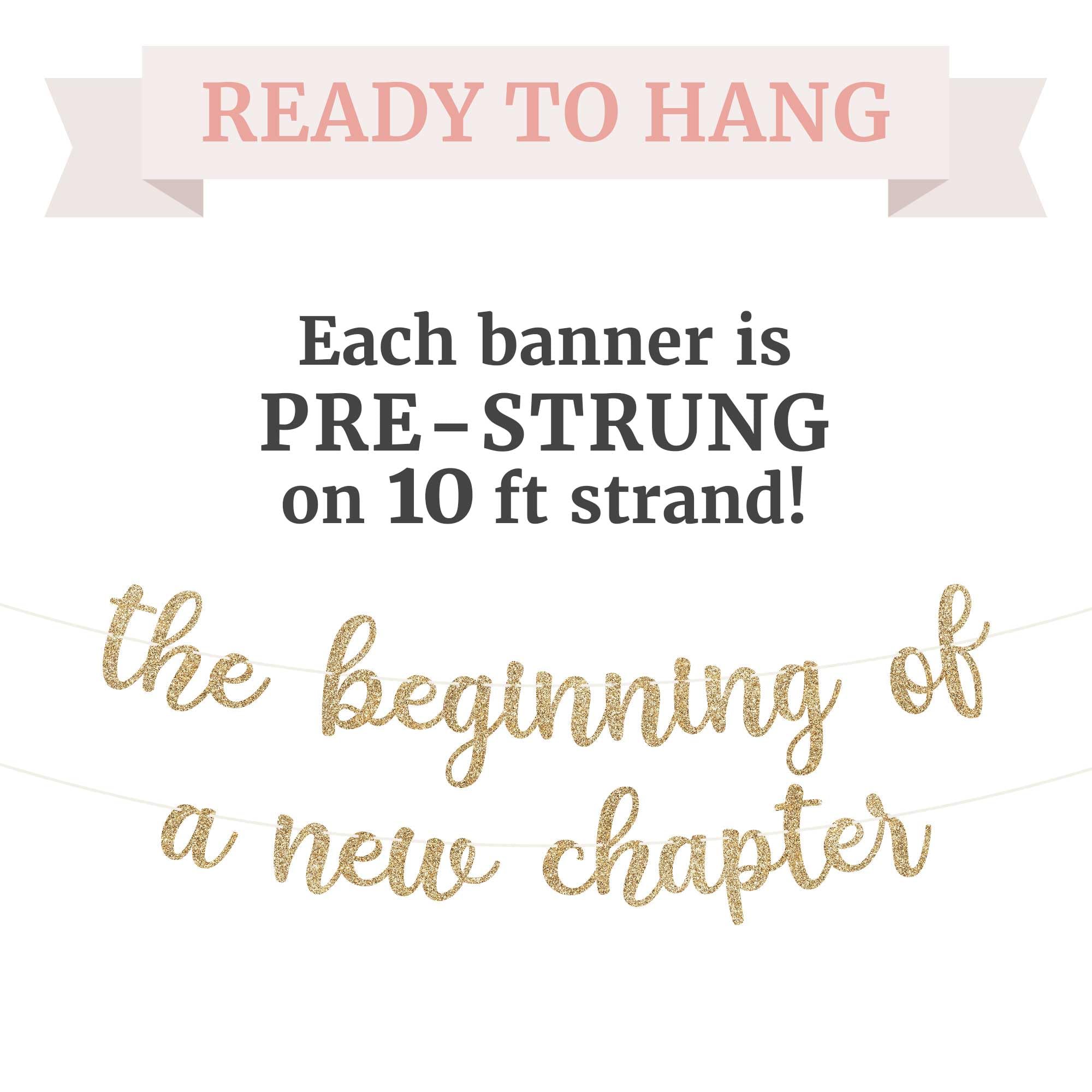 ☑️ PRE-STRUNG = NO WASTED TIME PUTTING THEM TOGETHER - Unlike others, our gold the beginning of a new chapter party banner will arrive to you with each letter already pre-strung on10 ft strands. No DIY required! All you have to do is hang and you’re ready to go. Perfect for marking life’s transitions, this banner is ideal for farewell going-away parties, engagements, graduations, retirements, divorces, vision board parties, or even a "Waiting to Exhale"-themed celebration.