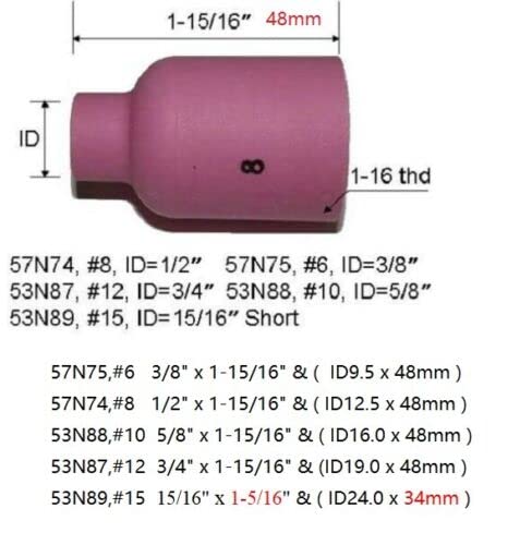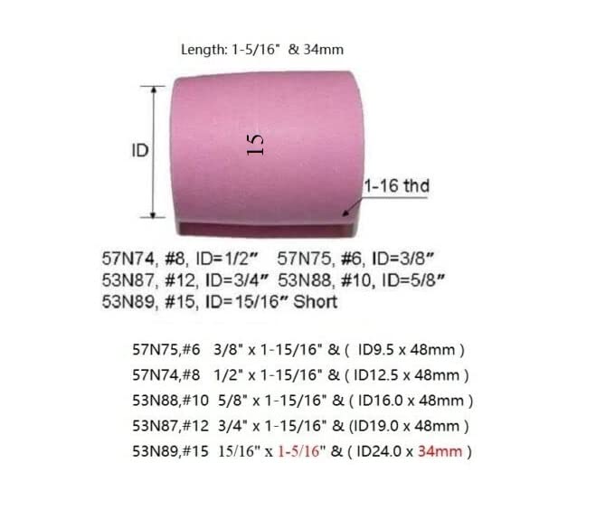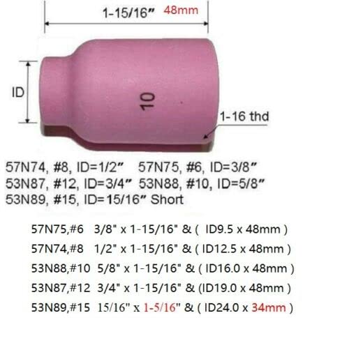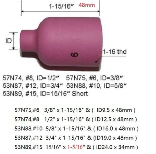 Large gas lens Alumina ceramic cups for large gas lens fit TIG welding torch 9 17 18 20 26 Package as following: 1pcs: Ref No: 57N75 6# 3/8" Orifice Size:( 3/8" x 1-15/16" ) D9.5 x 48mm 1pcs: Ref No: 57N74 8# 1/2" Orifice Size:( 1/2" x 1-15/16" ) D12.5 x 48mm 3pcs: Ref No: 53N88 10# 5/8" Orifice Size: ( 5/8" x 1-15/16" ) D16 x 48mm 3pcs: Ref No:53N87 #12 3/4" Orifice Size: ( 3/4" x 1-15/16" ) D19 x 48mm 2pcs: Ref No:53N89 #15 15/16" Orifice Size: (15/16" x 1-5/16) D24 x 34mm These Alumina Large Gas Lens fit all 9 17 & 26 series air cooled torches and 18 20 series water cooled torches including the Lincoln PTA-17 PTA-18 and PTA-26 torches Miller Diamondback DB17 DB18 and DB 26 torches, along with the Weld craft WP-17, WP-18 and WP-26 torches.