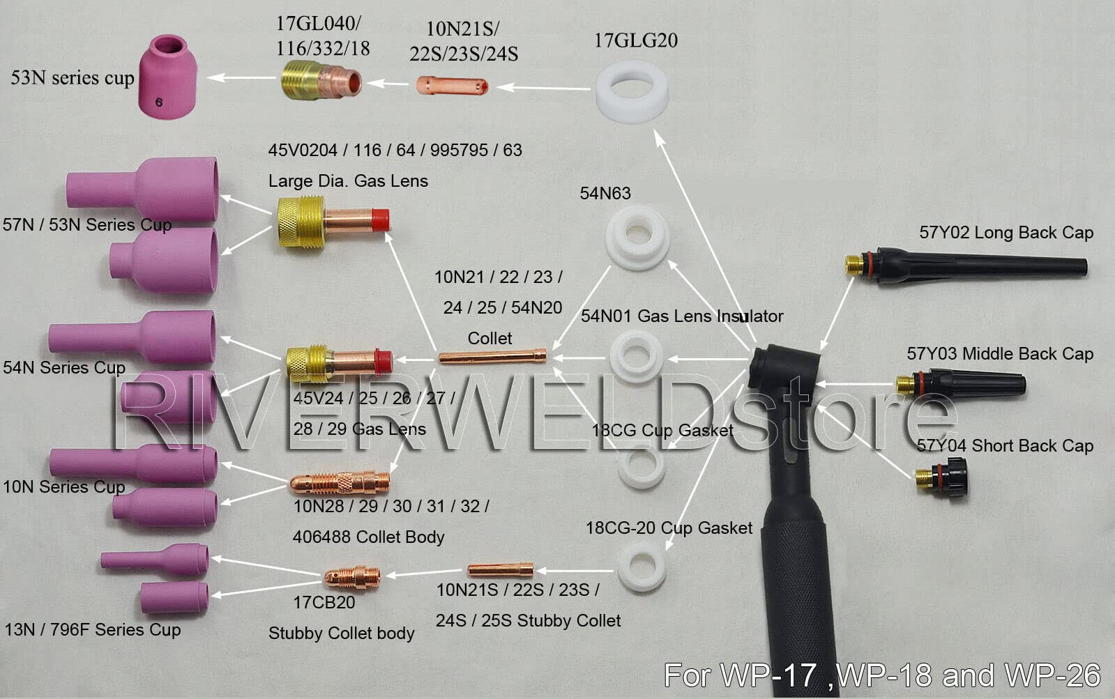 Work with large diameter gas lens 45V0204 45V116 45V64 995795 45V63 collet bodies in 17/18/26 Series TIG Torches; Work with Large Diameter Gas Lens 45V0204S 45V116S 45V64S 995795S Collet Bodies in 9 20 25 Series TIG Torches
