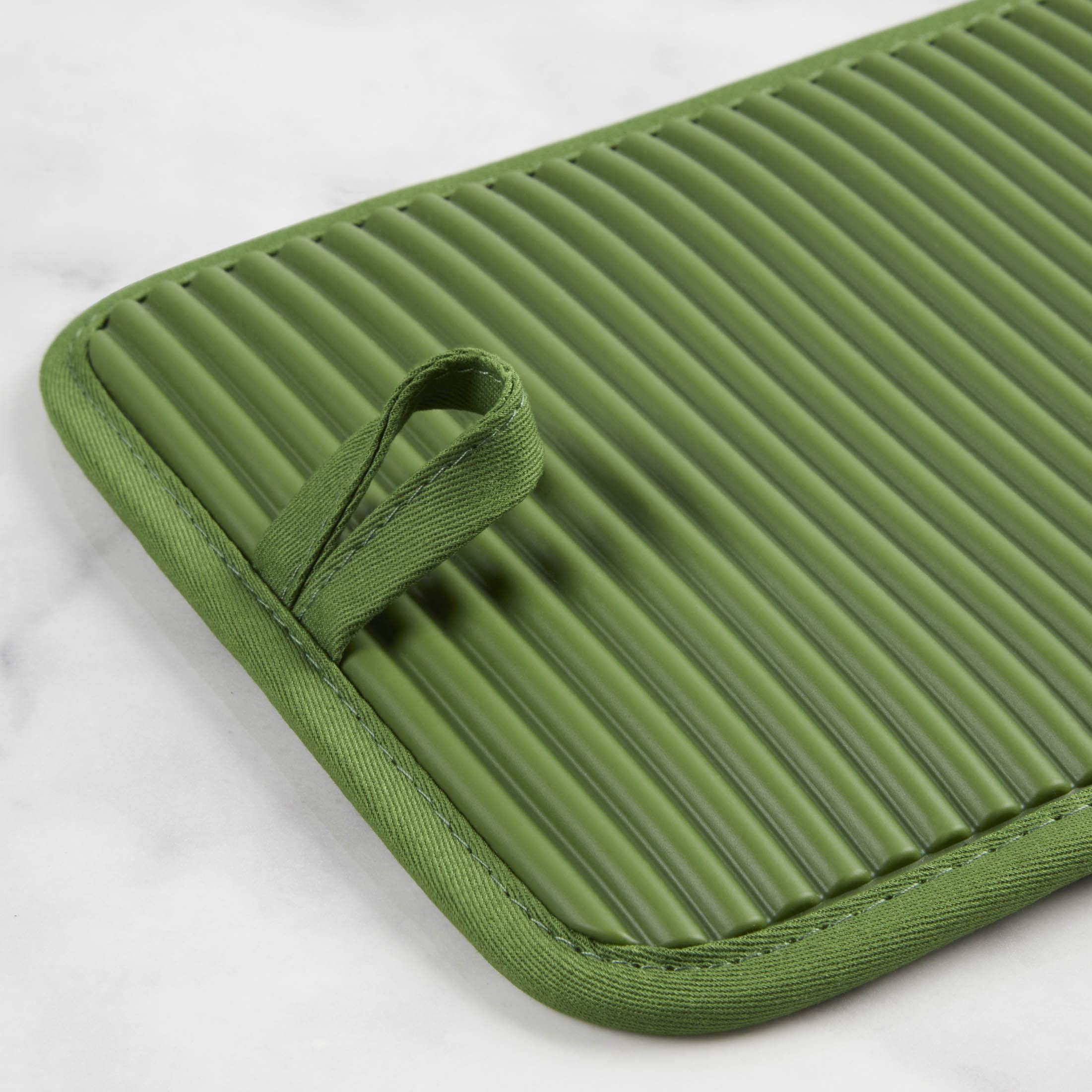 Perform your kitchen tasks safely with the KitchenAid Ribbed Soft Silicone 2-Piece Pot Holder Set. Made of waterproof silicone on one side and durable cotton on the other side for additional shield from the heat. Featuring a pocket with polyester lining for comfort and insulation. Each pot holder measures 7 inches wide by 9 inches long. They are heat resistant up to 500 degrees Fahrenheit. Coordinate these pot holders with coordinating KitchenAid Ribbed Soft Silicone Oven Mitts for a complete set.