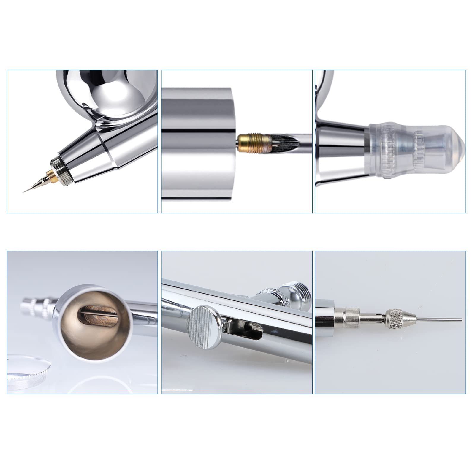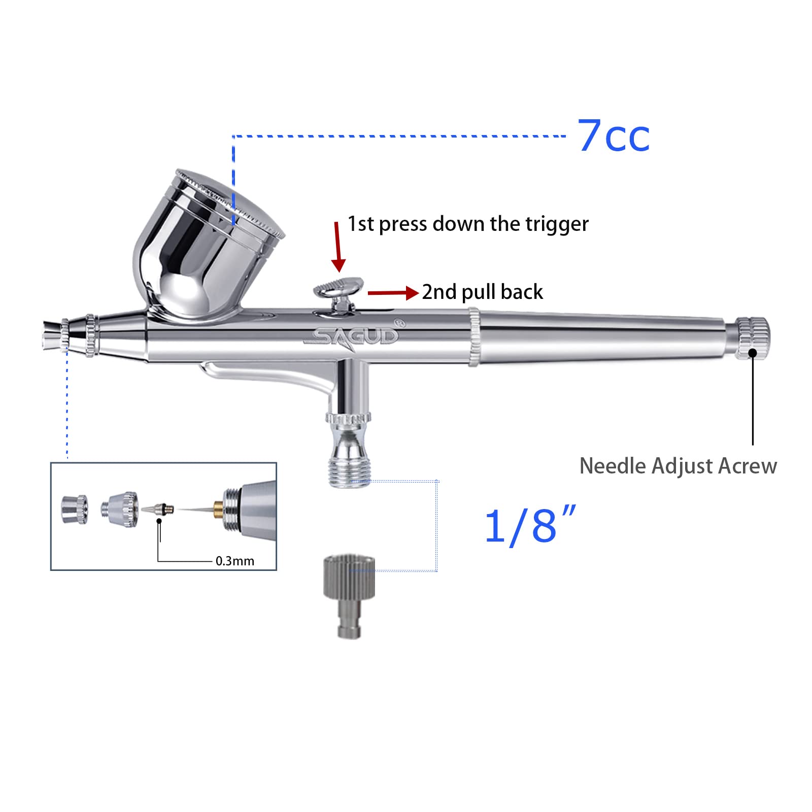 AIRBRUSH KITS: Air brush kit is 0.3mm airbrush set with 0.3mm nozzle & needle. The cup capacity is 1/3 oz. SAGUD airbrushes are all with quick release disconnect coupler fitting and a kit of airbrushing O-Ring.