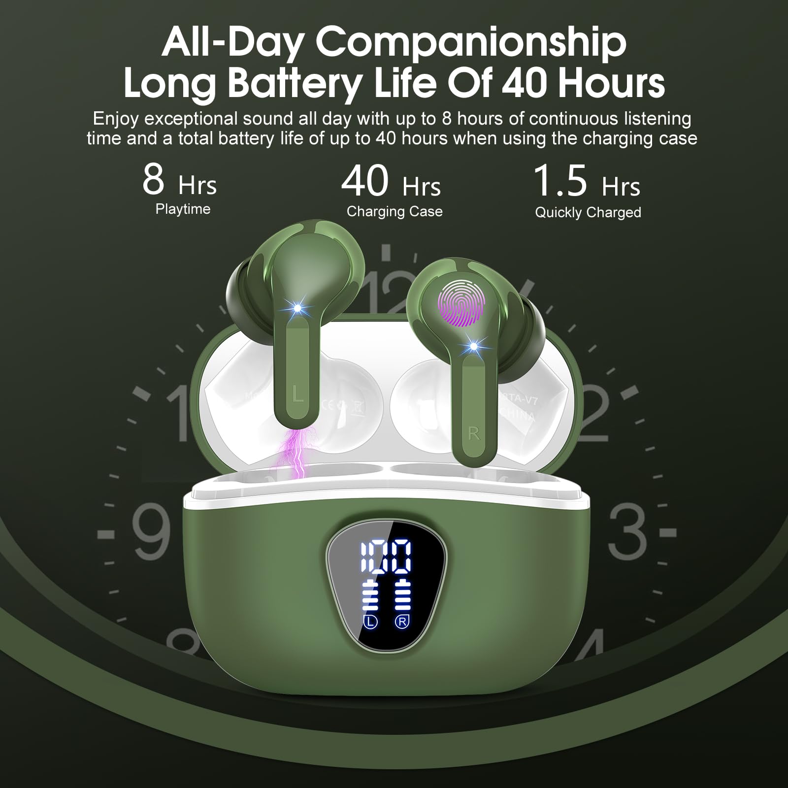48H long-lasting battery life & dual LED digital display: Up to 8 hours of music playback on a single charge (1.5h only) with the charging box, this in ear headphones offers up to 48H of battery life, ensuring you can use it for a long time without frequent charging.The LED display clearly shows the battery level of the earbuds wireless bluetooth and the charging box, ensuring you always know the remaining power and enjoy an uninterrupted music experience during a long journey or a busy workday.